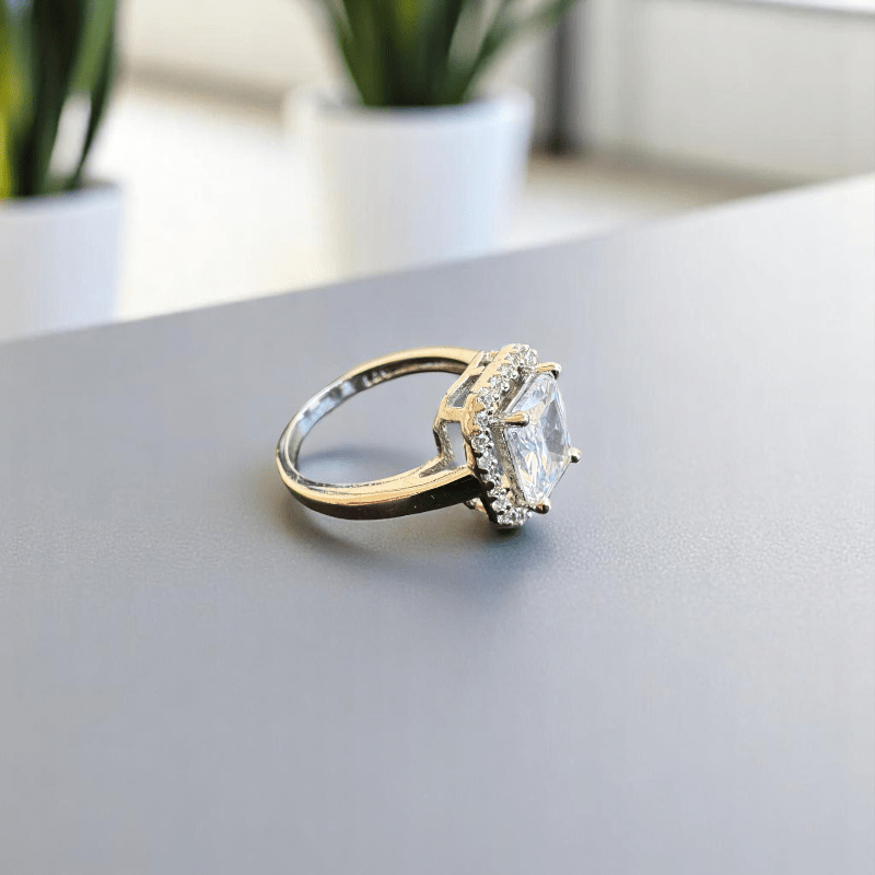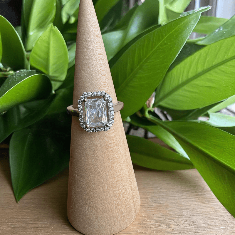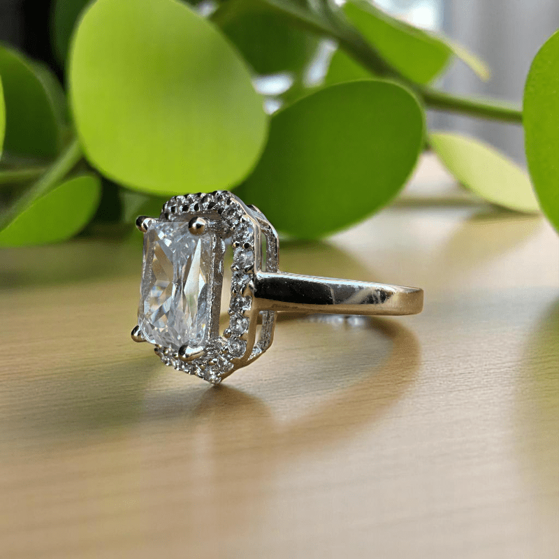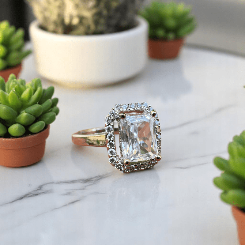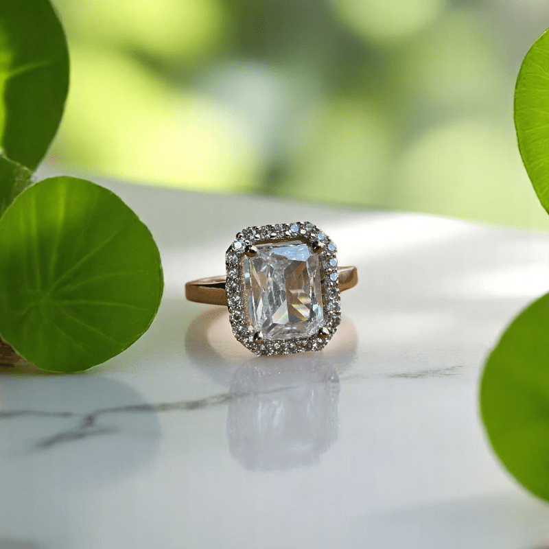 - At its heart lies a stunning emerald-cut Cubic zirconia, carefully set to reflect maximum light and brilliance—creating a centrepiece that feels regal and refined.