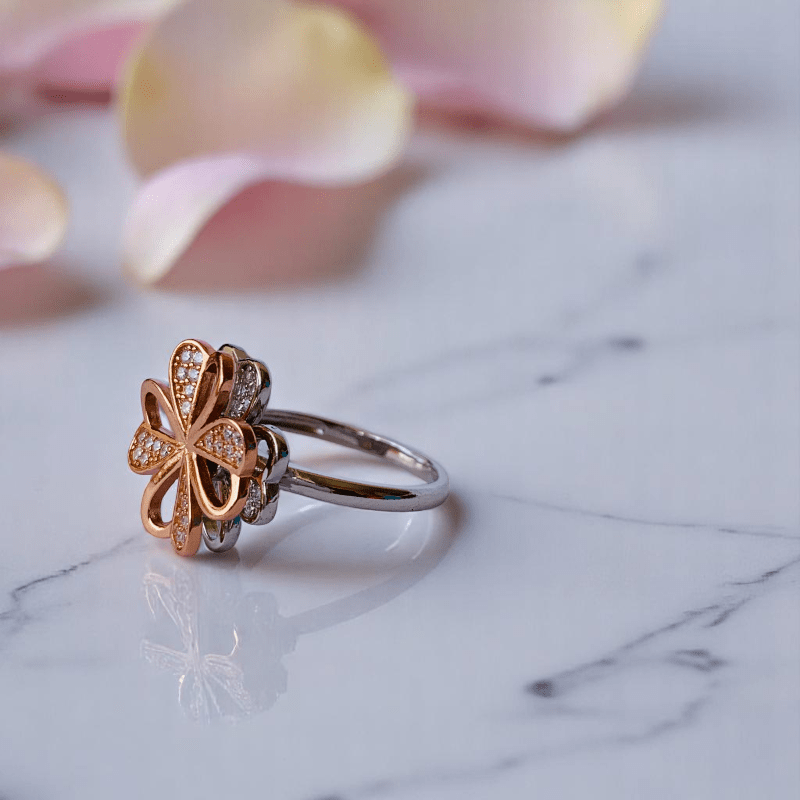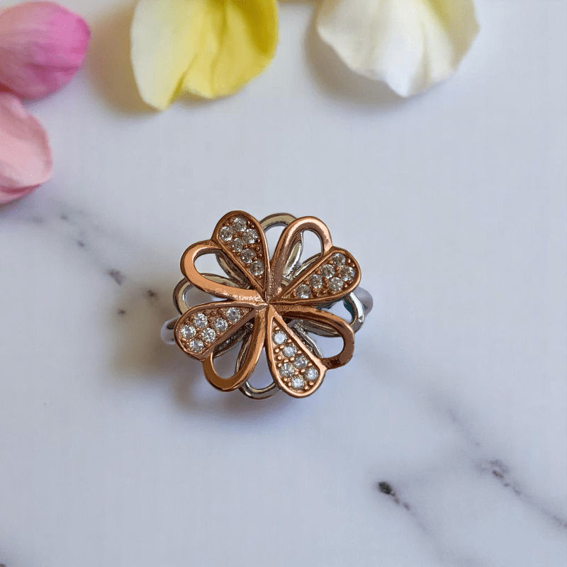 - The bottom layer shines in classic silver, while the top layer blooms in warm rose gold, creating a striking dual-tone effect that adds both contrast and sophistication.