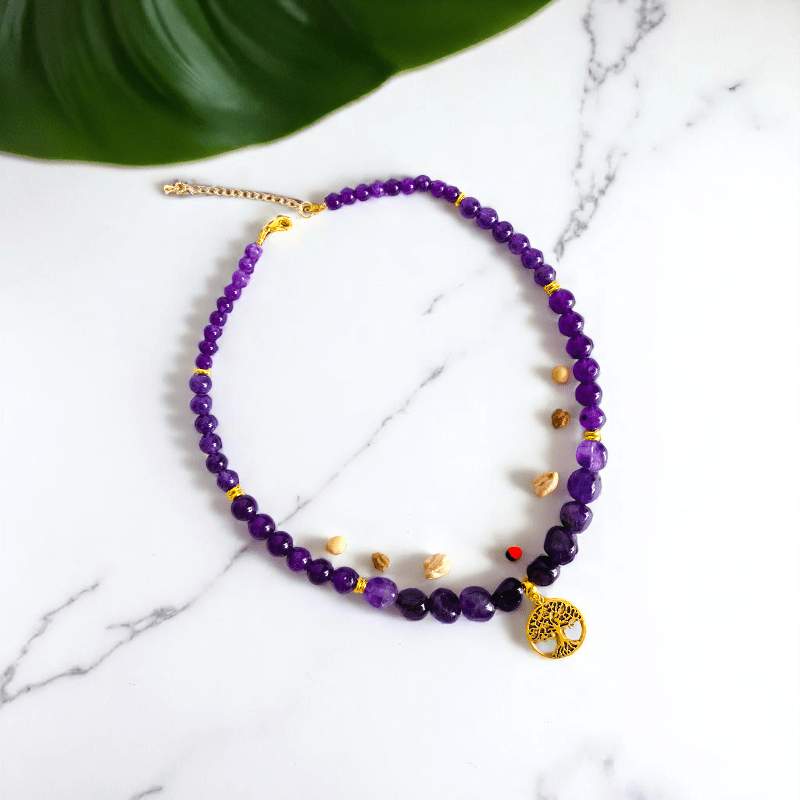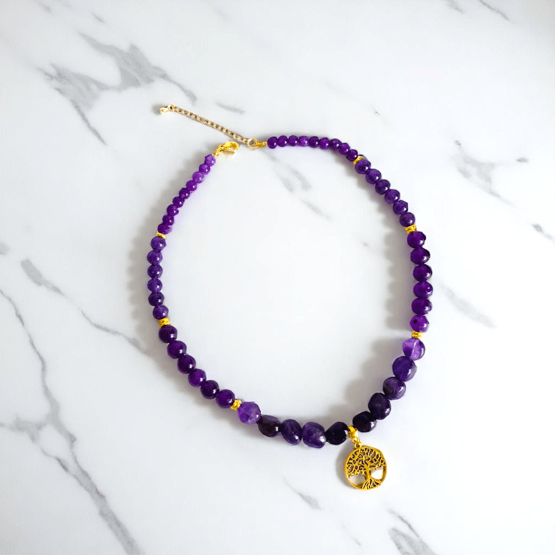 - Embrace elegance and spiritual energy with this Amethyst Stone Necklace, featuring a beautifully crafted Tree of Life pendant.