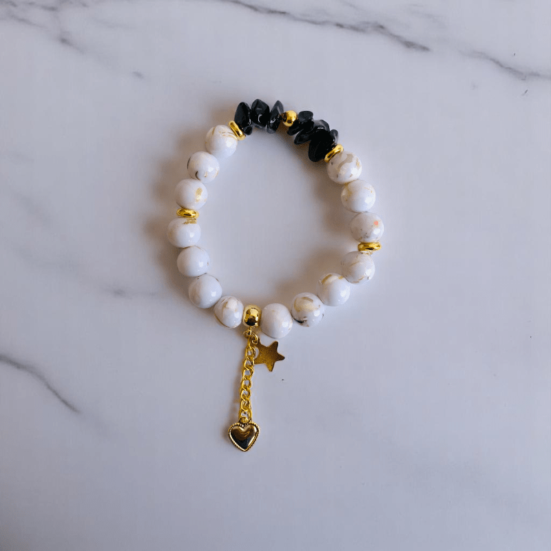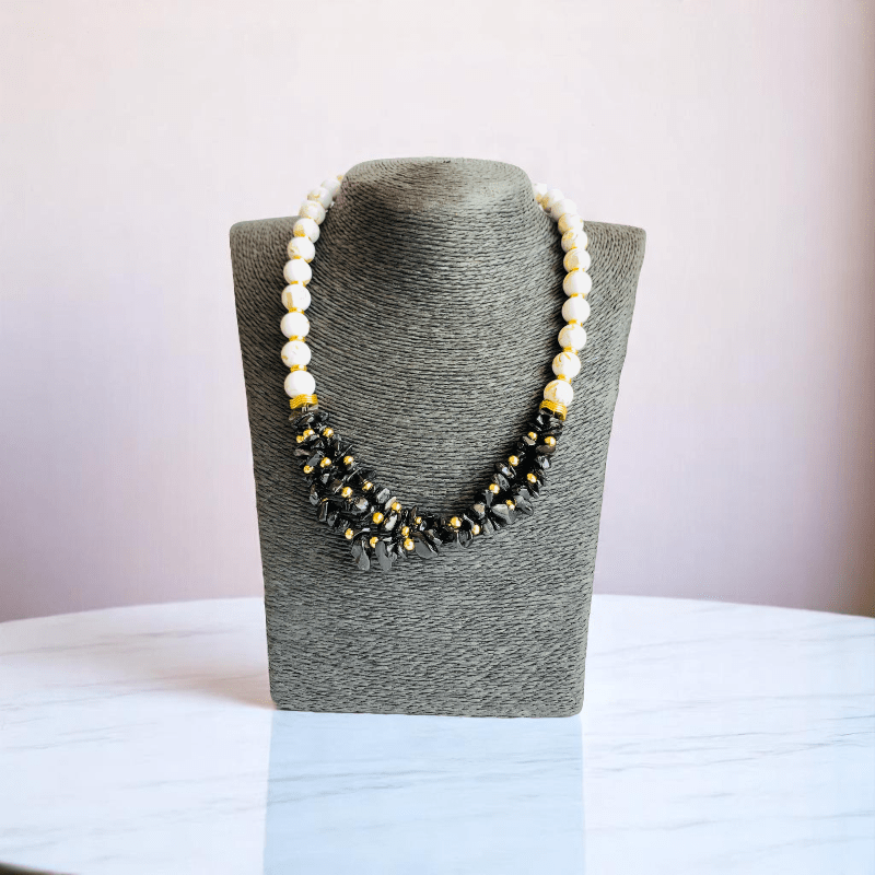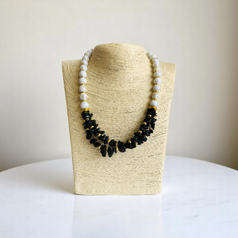A bold and elegant design showcasing Black Obsidian chip stones and Mother of Pearl beads, creating a striking contrast of deep black and iridescent white.