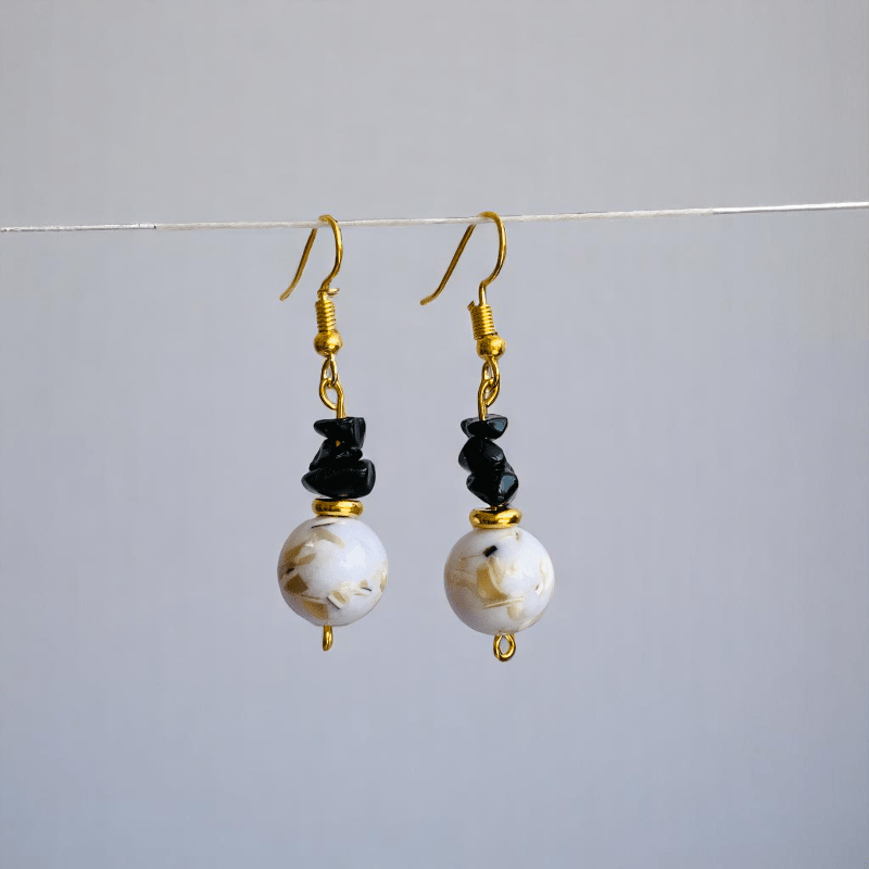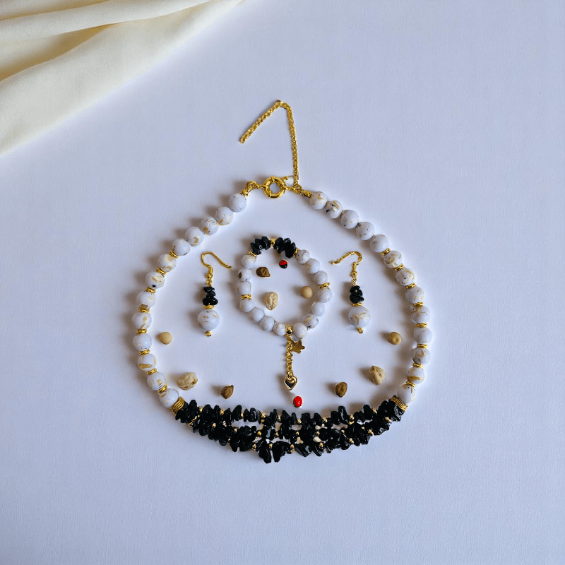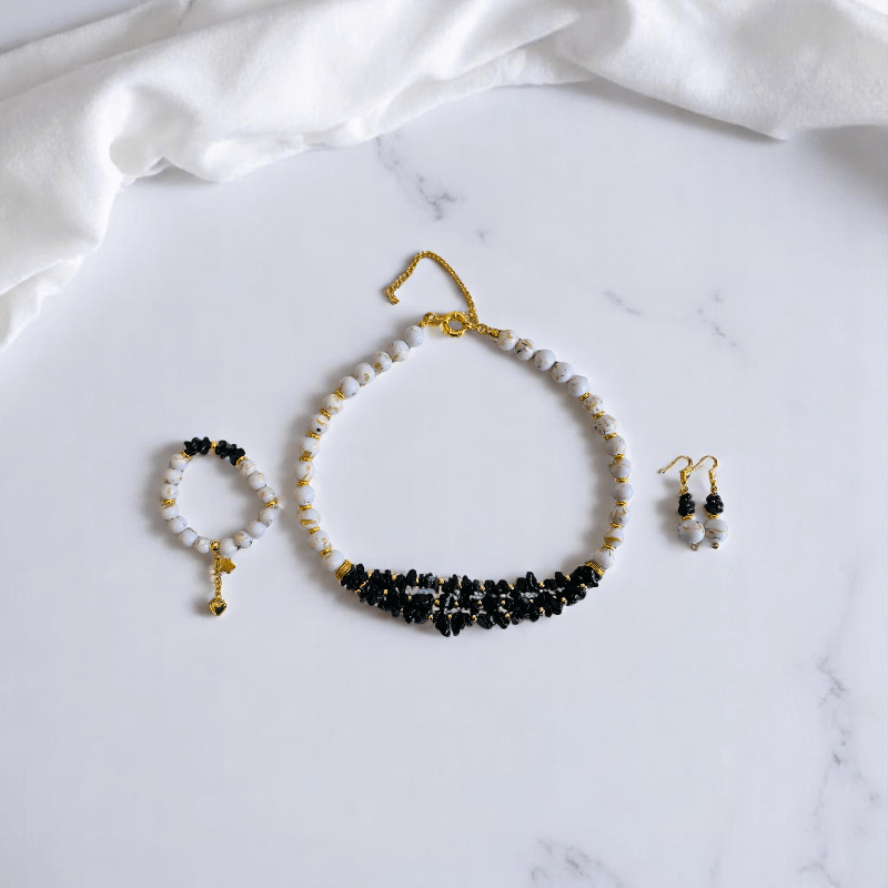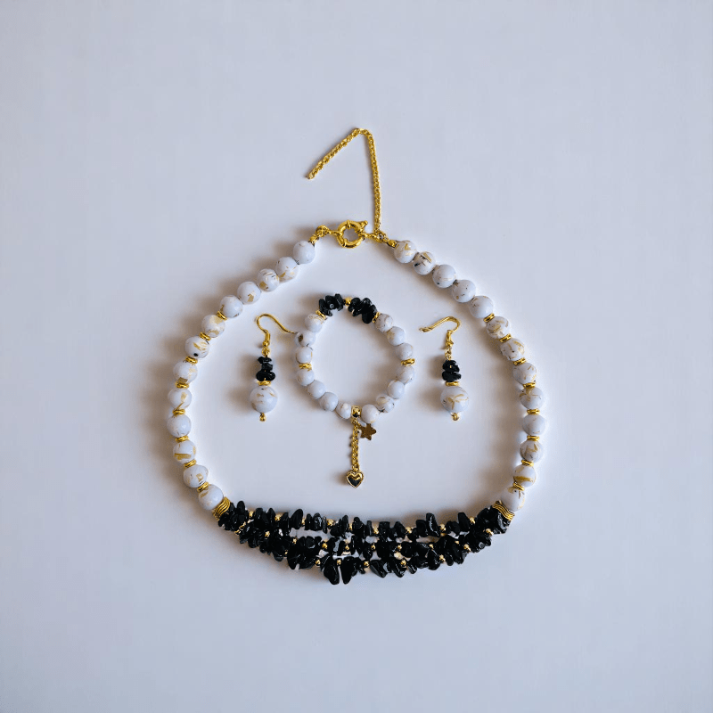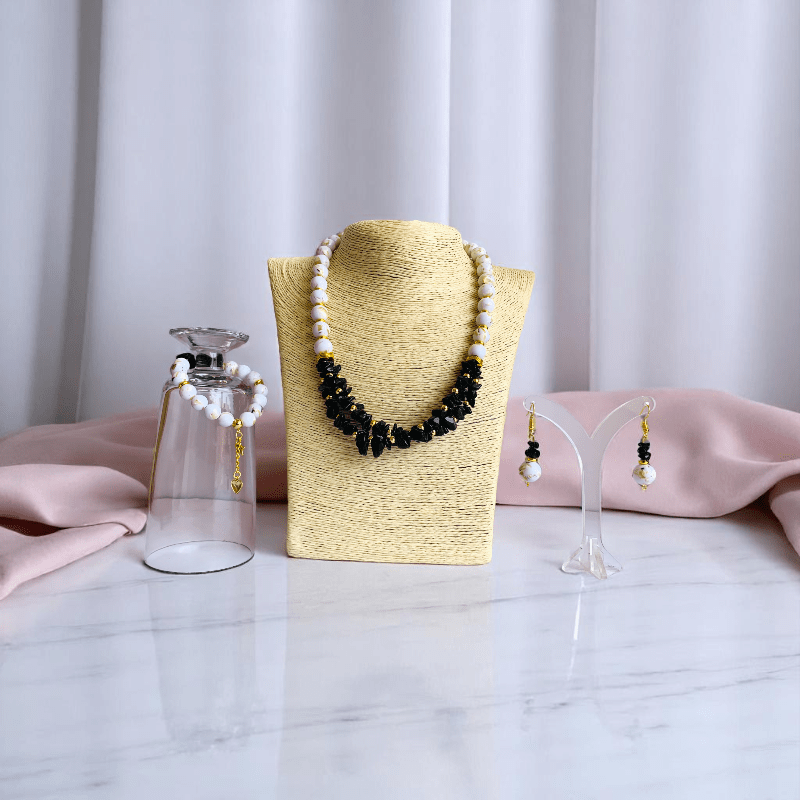 Obsidian Pearl Elegance Set | Black Obsidian & Mother of Pearl Stone - For Women | Includes: Necklace, Bracelet, Earring