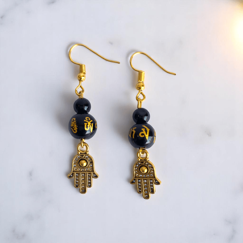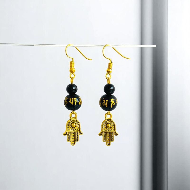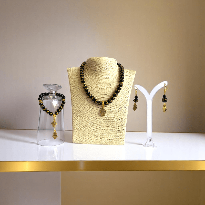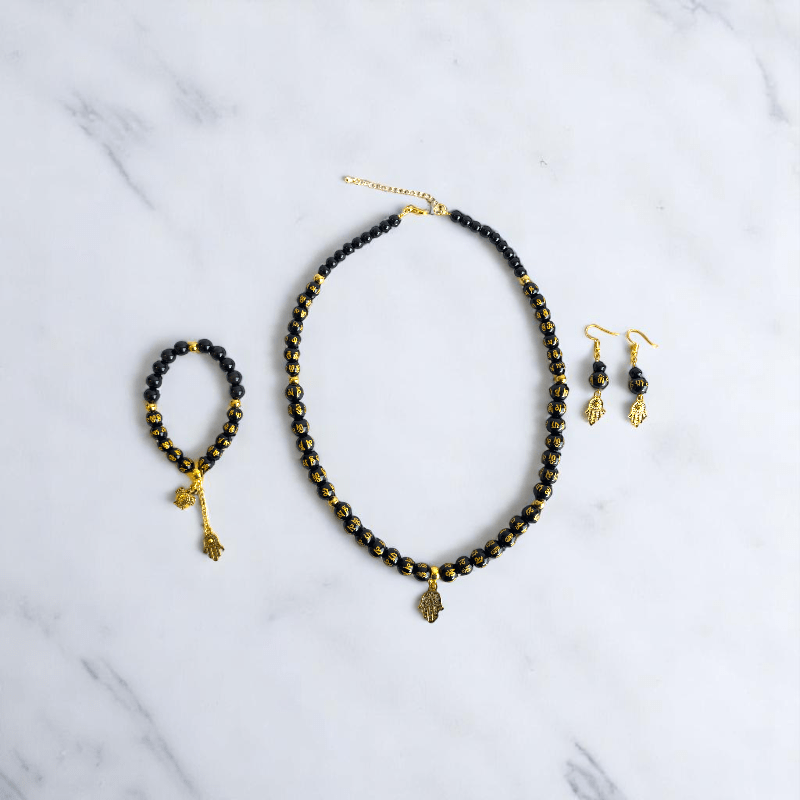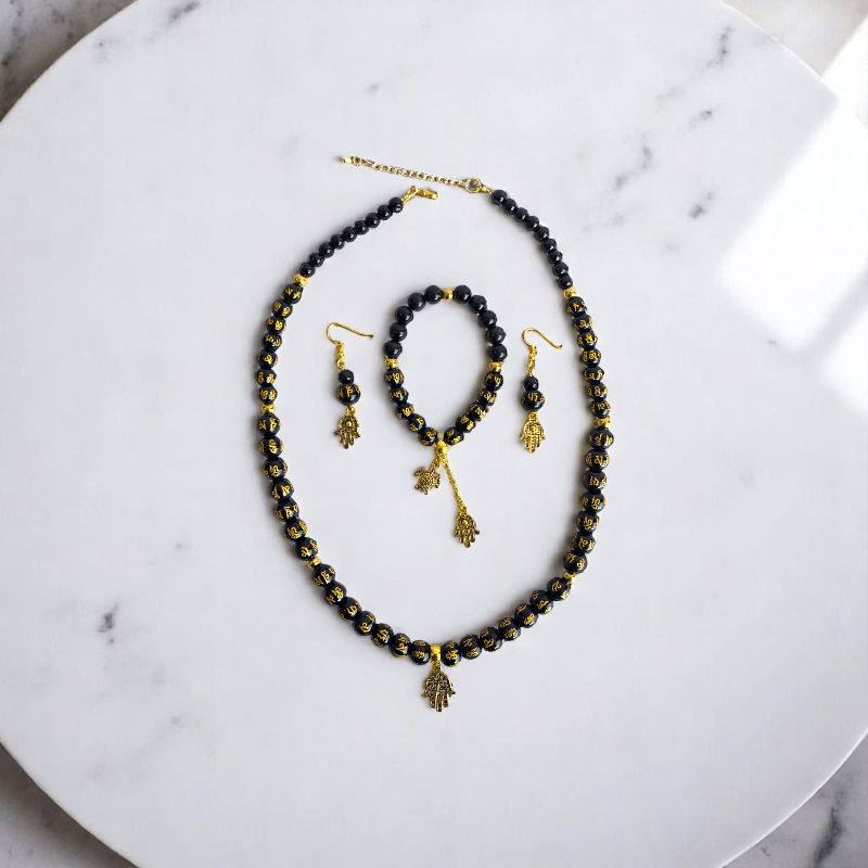 Black Om Mani Hamsa Set | Stainless Steel - For Women | Includes: Necklace, Bracelet, Earrings