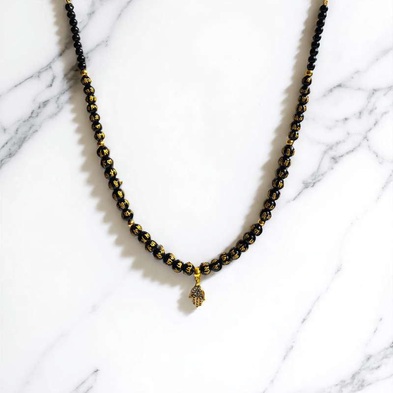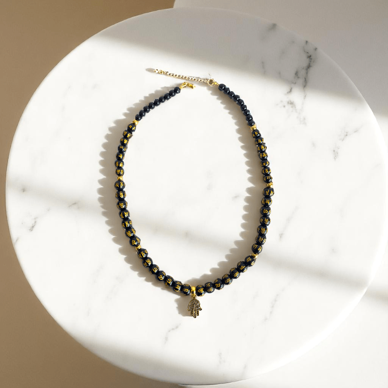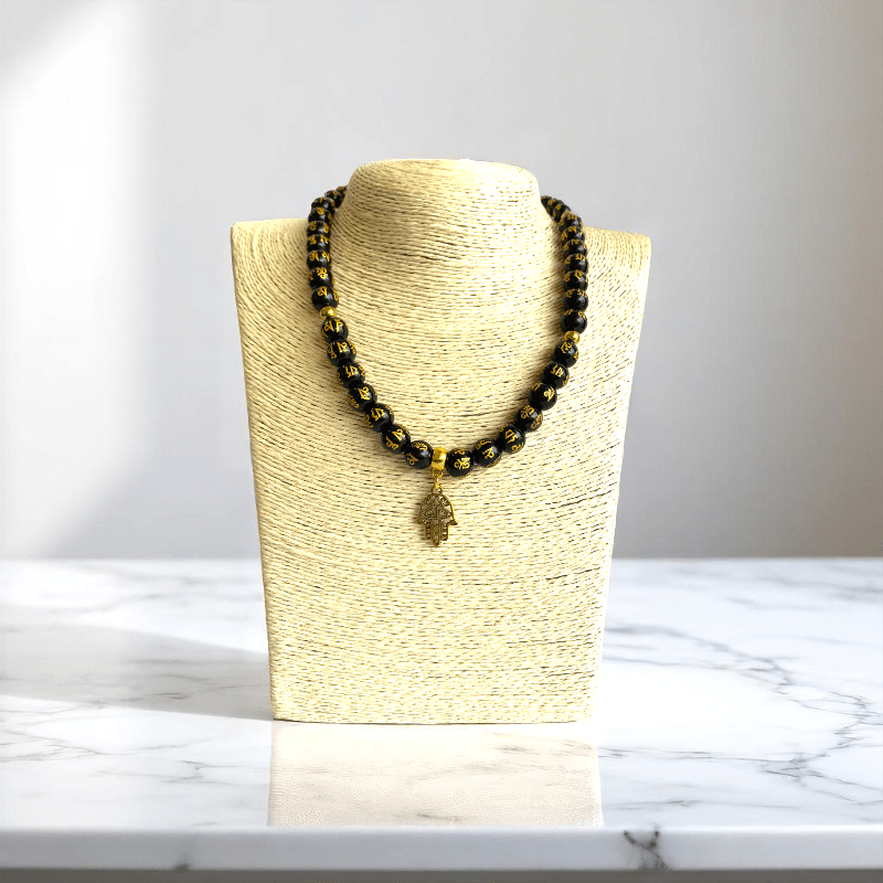 - Elevate your style with the Black Om Mani Stone Necklace, featuring a striking golden pendant, Bracelat and a matching Necklace of hypoallergenic zinc alloy earrings.