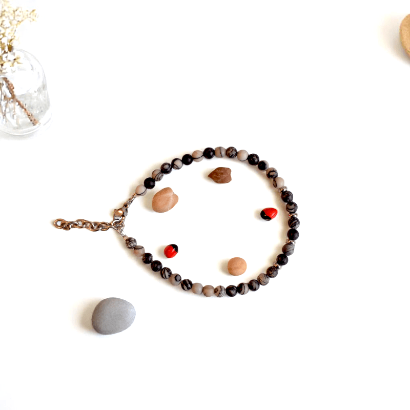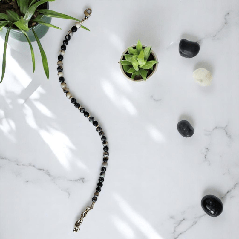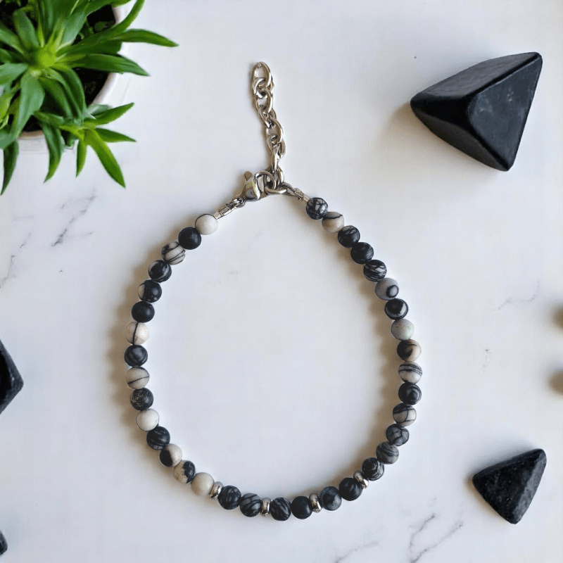 - Gift your little one a touch of protection and grounding energy with the Black Web Jasper Stone Anklet.