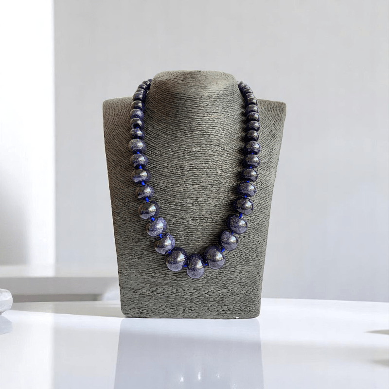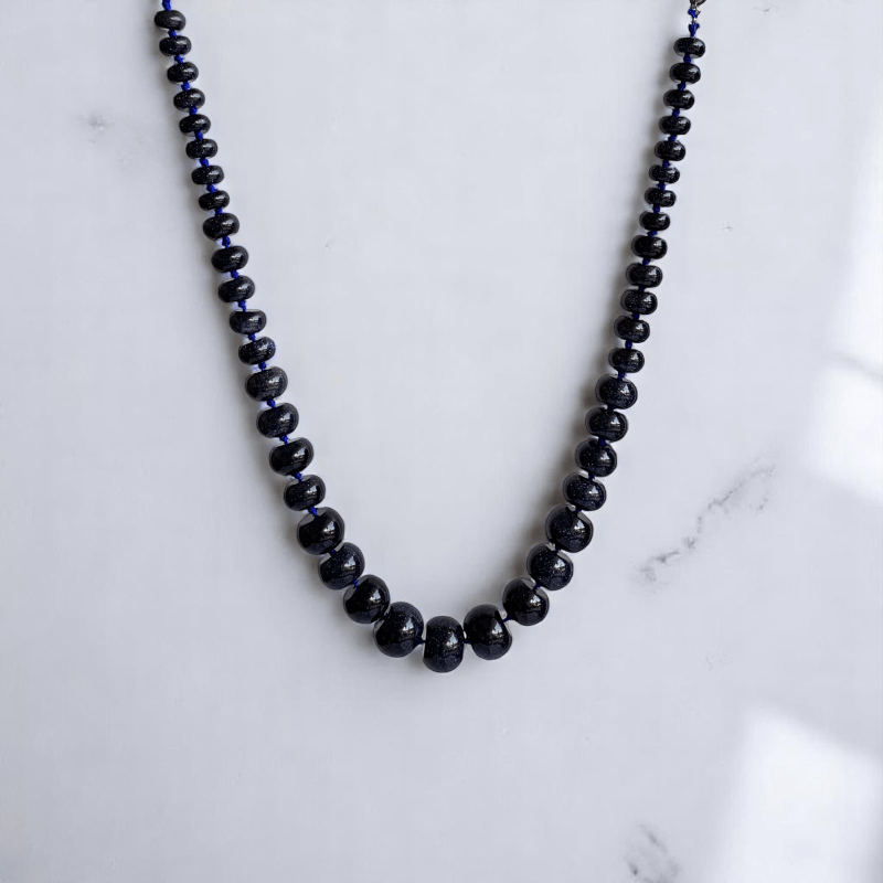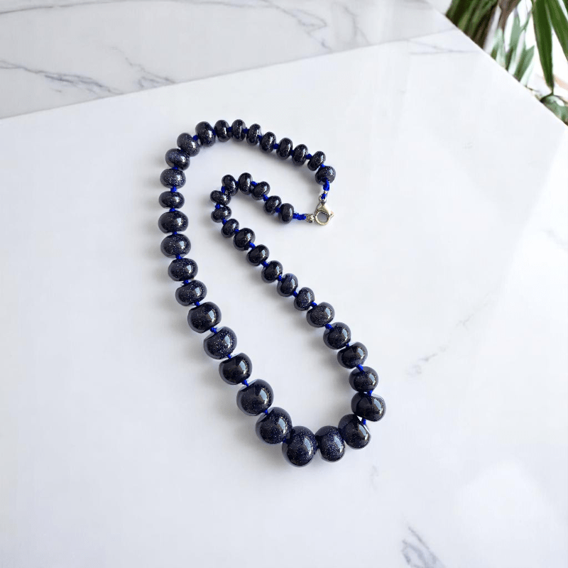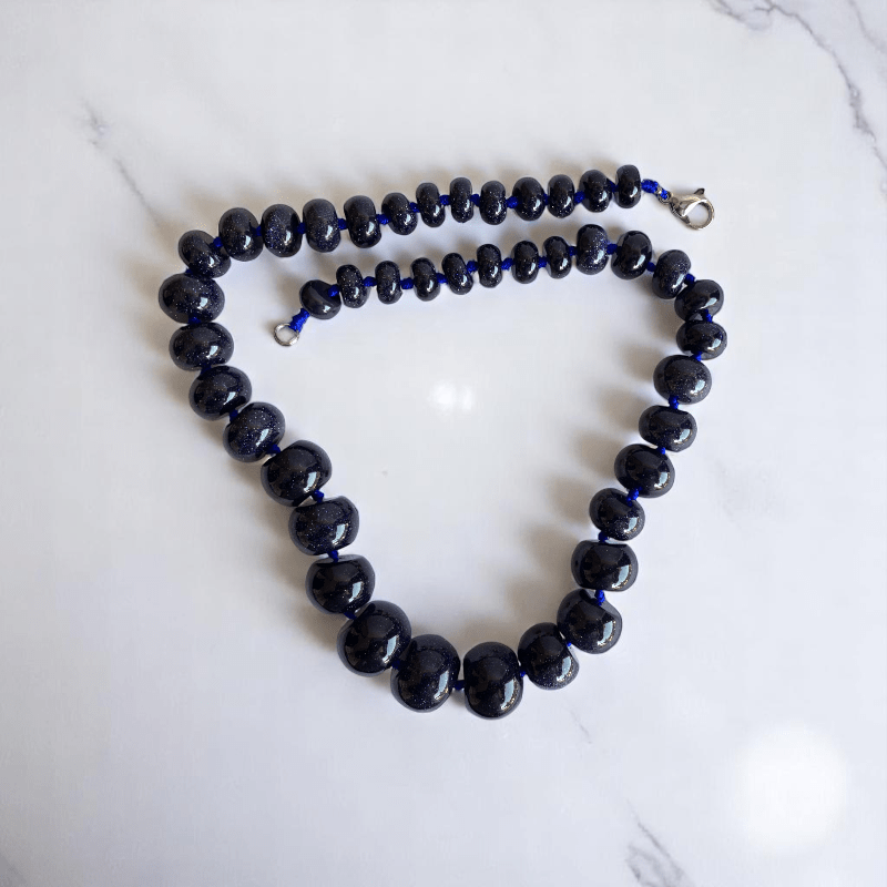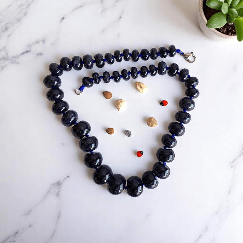 - Blue Sandstone Oblate Necklace shimmers like a starry night sky.