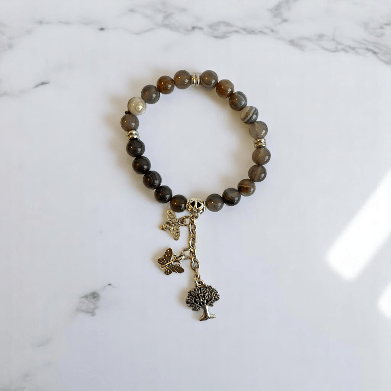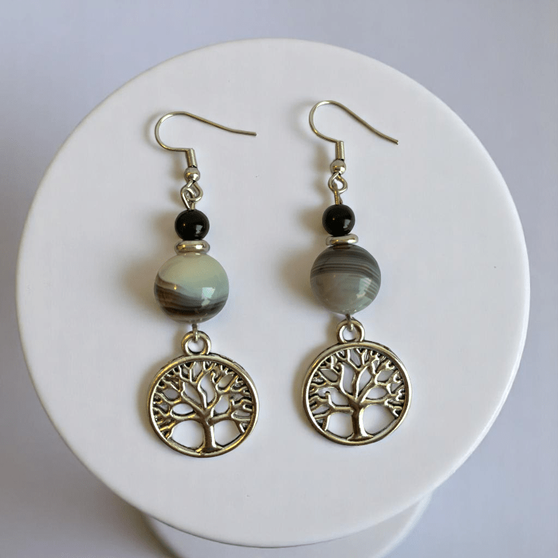 - Each piece is adorned with unique Botswana Agate stones for a harmonious look.