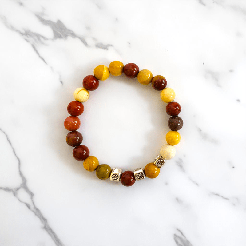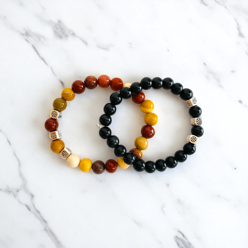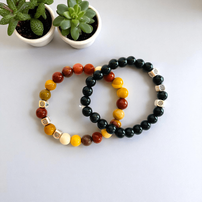 - The second bracelet features Mookite, a dynamic stone that brings balance, energy, and vitality.