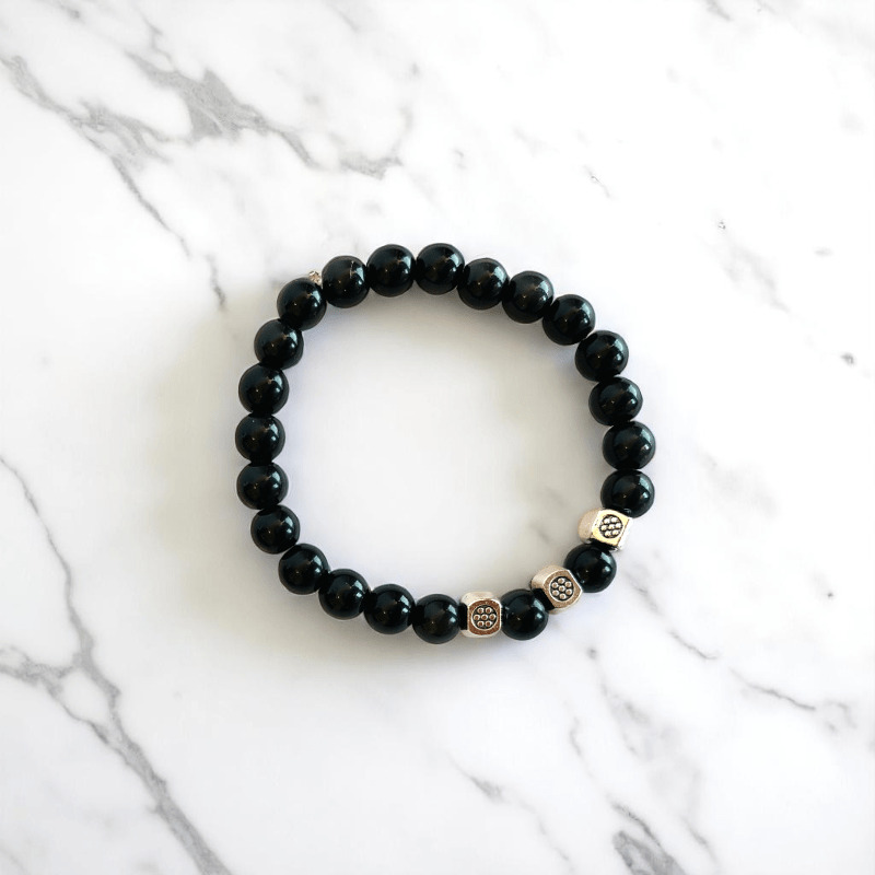 - The first bracelet is made with Black Obsidian, a powerful stone known for its grounding properties and protective energy.