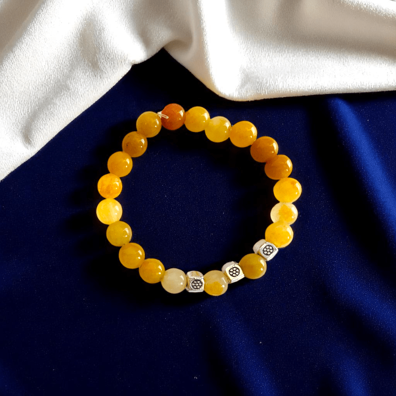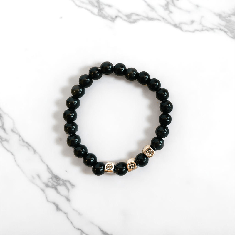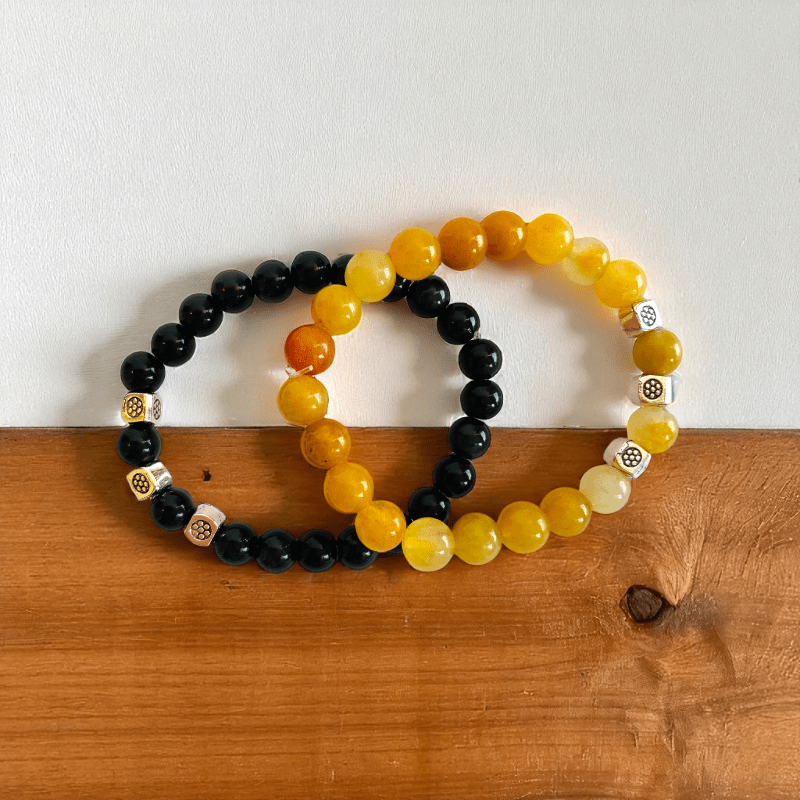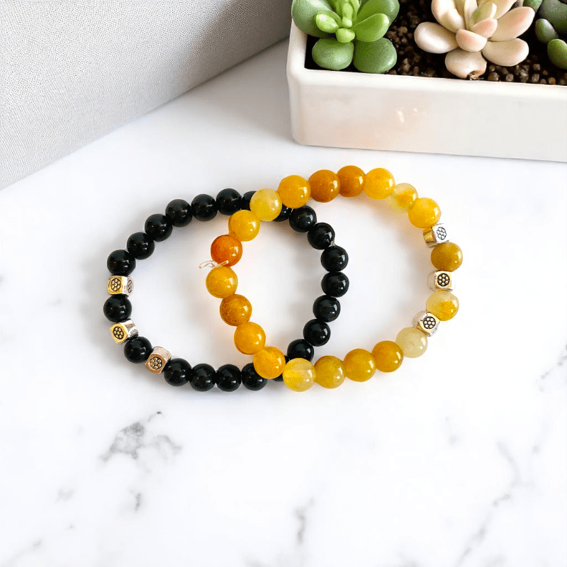 - One bracelet features the powerful Black Obsidian stone, while the other is made from the bright and uplifting Yellow Aventurine stone.