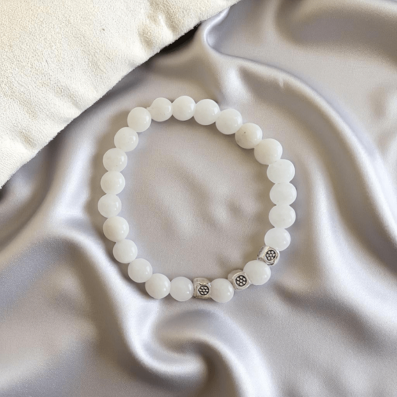 - The second bracelet features White Jade, a stone known for its calming and intuitive energy.