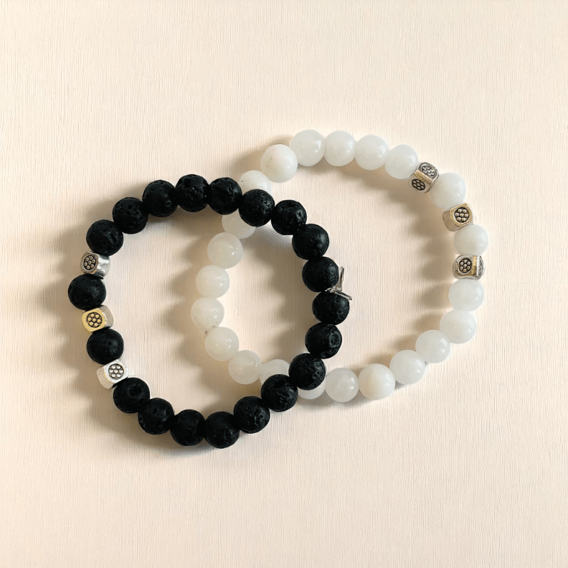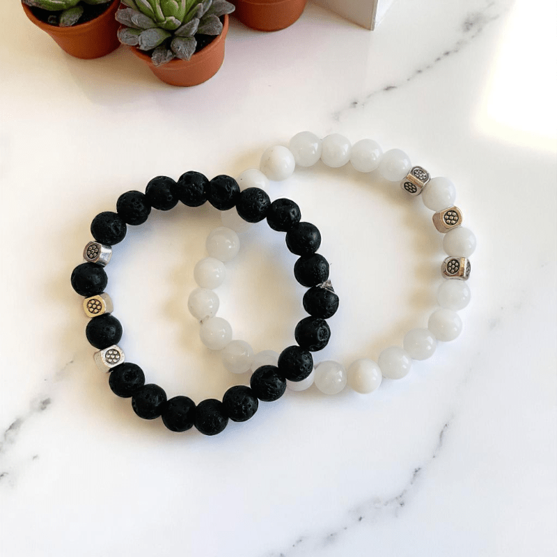 - This Set of Two Bracelets combines the strength and grounding energy of Lava Stone with the soothing and intuitive properties of White Jade, creating a perfect balance of power and peace for boys and girls.