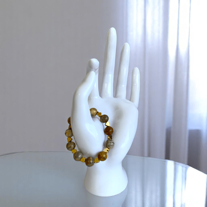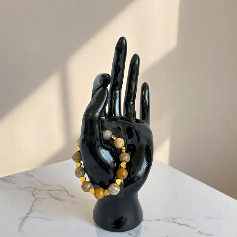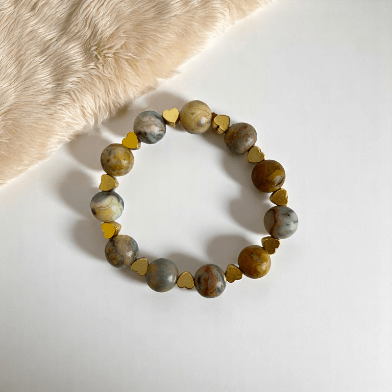 This eye-catching bracelet features natural Crazy Lace Agate stones, known for their swirling patterns and stunning mix of colors like cream, grey, gold, and rust—each bead a little piece of wearable art.