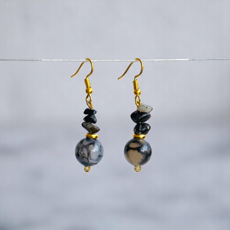 - This handcrafted set includes a bracelet and a pair of earrings, featuring the mystical beauty of Dragon Agate beads and chips, known for their dramatic patterns and rich, deep tones ranging from smoky grays to fiery browns and blacks.