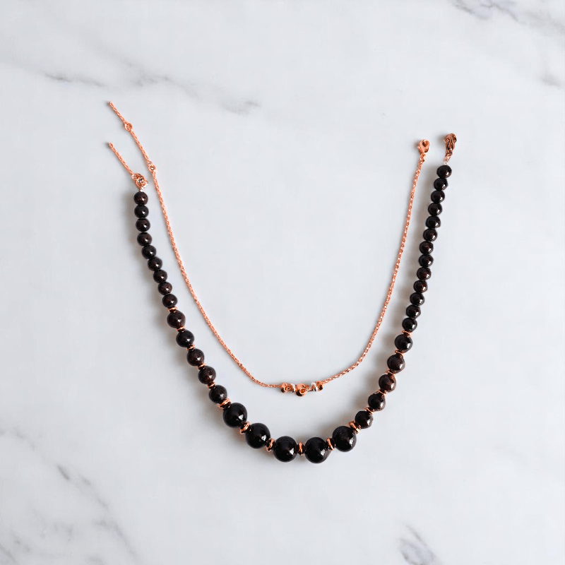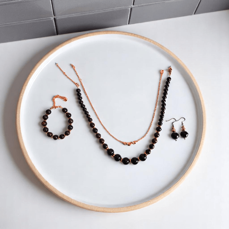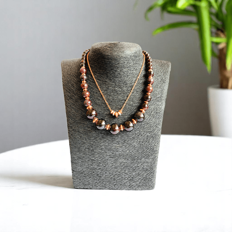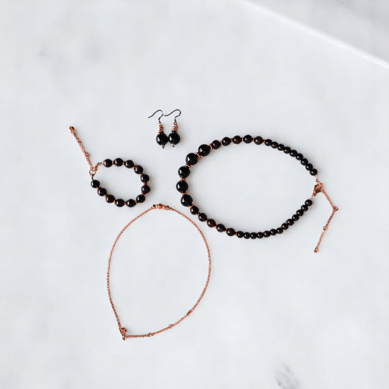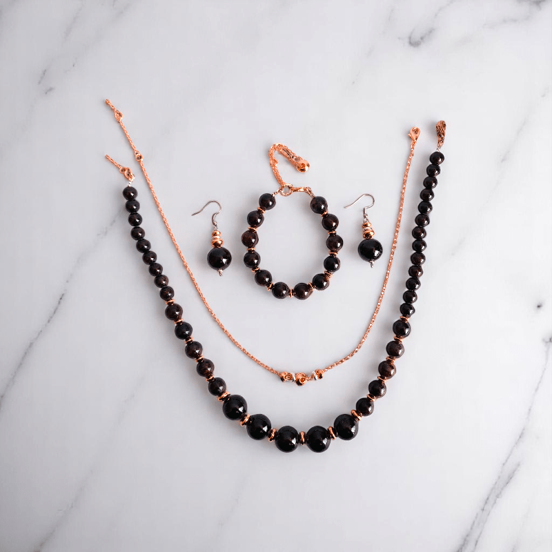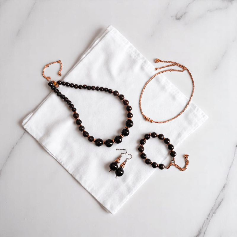 - This stunning set includes a Garnet necklace, a stylish chain, a bracelet, and a matching pair of earrings, all accented with hypoallergenic Zinc Alloy spacer beads and chain for a sleek, modern touch.