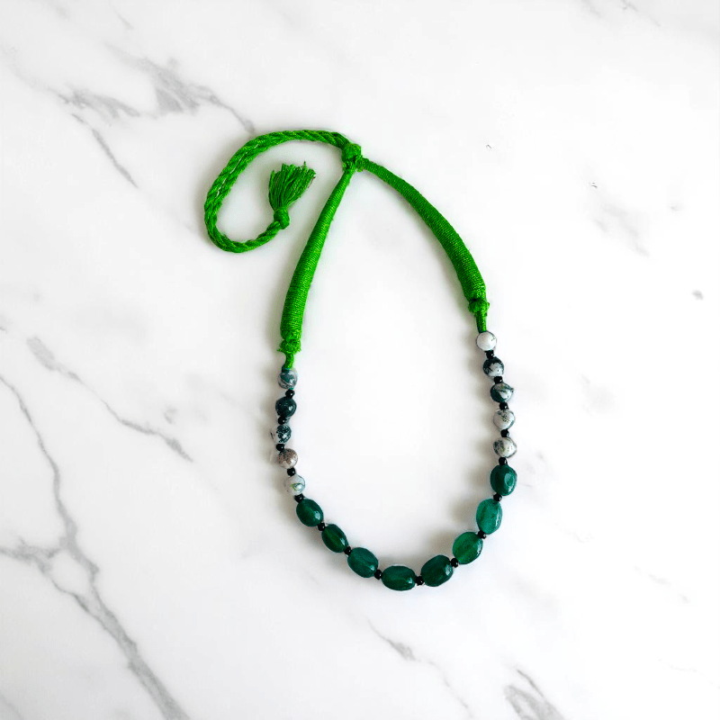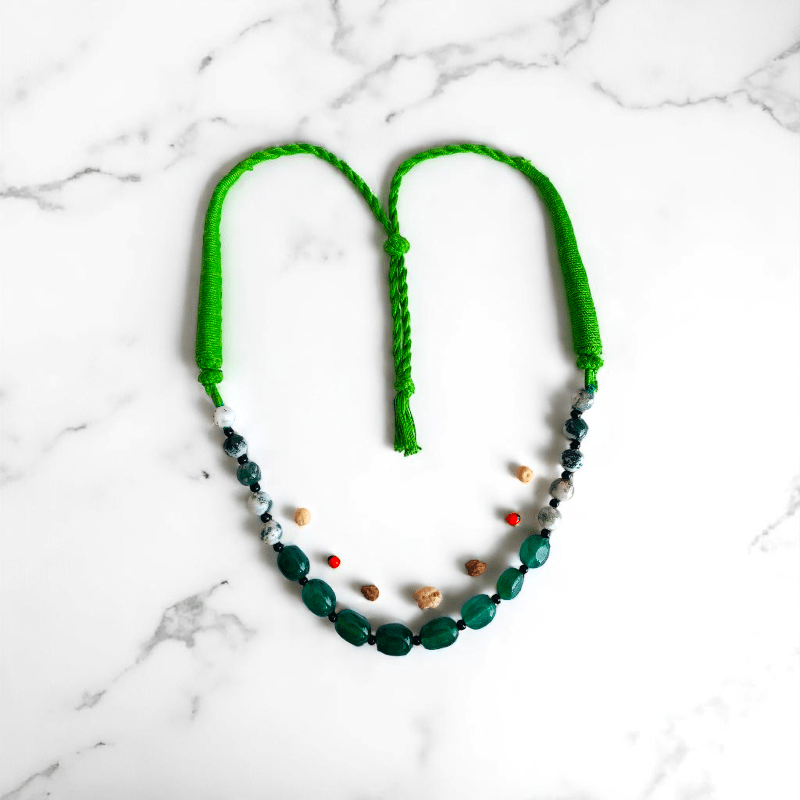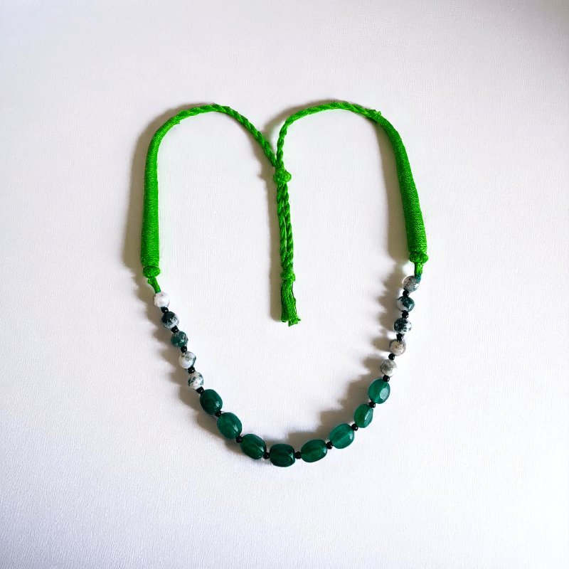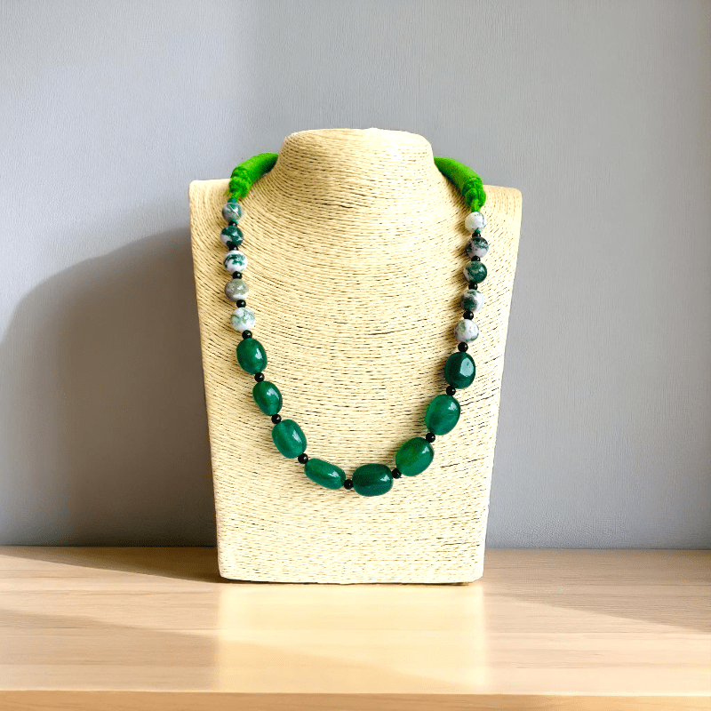 - This naturally elegant piece combines the soft shimmer of green aventurine with the earthy, marbled patterns of tree agate, creating a look that is both refreshing and grounded.