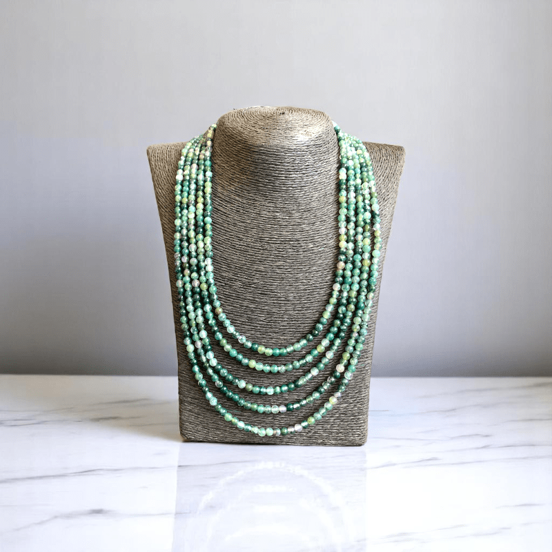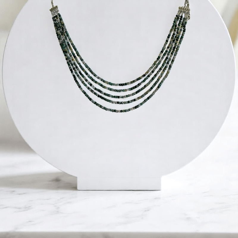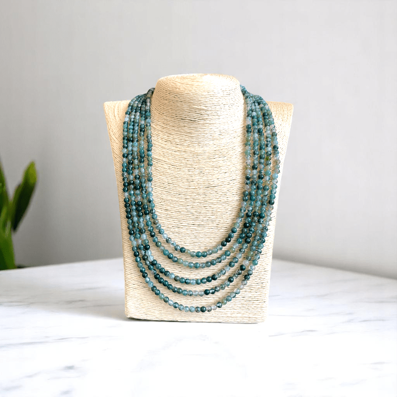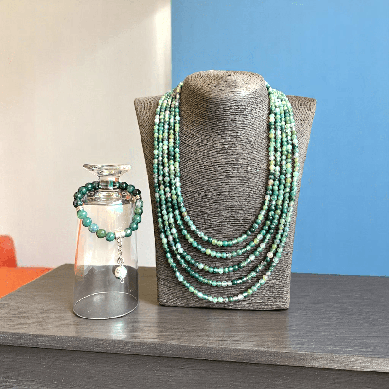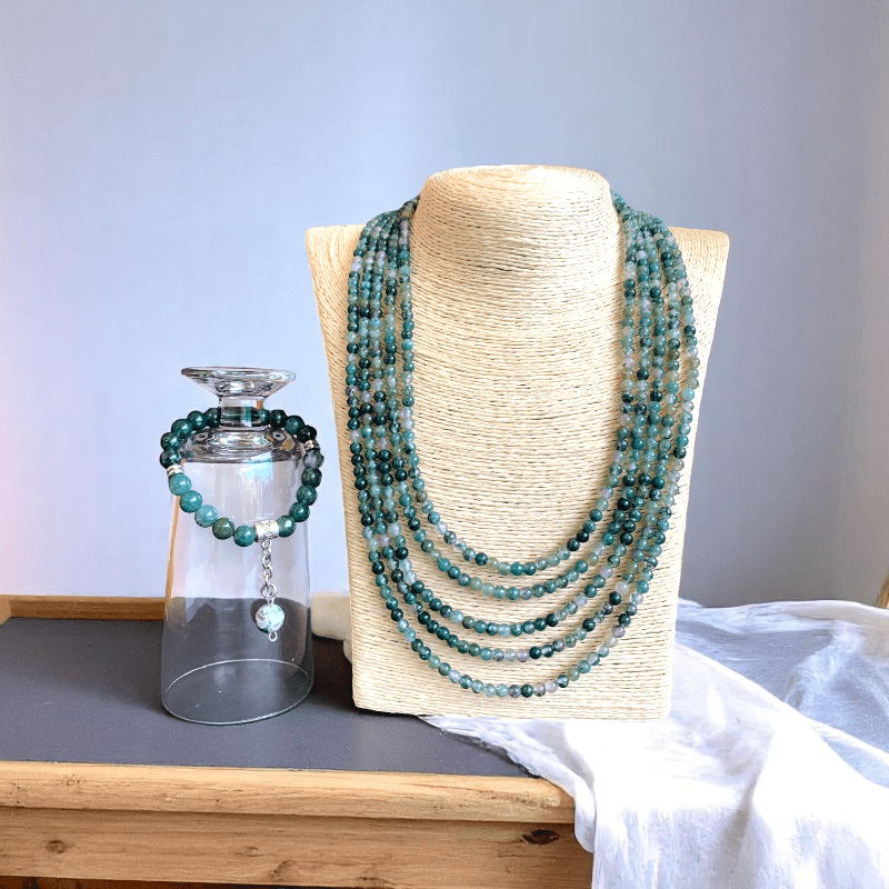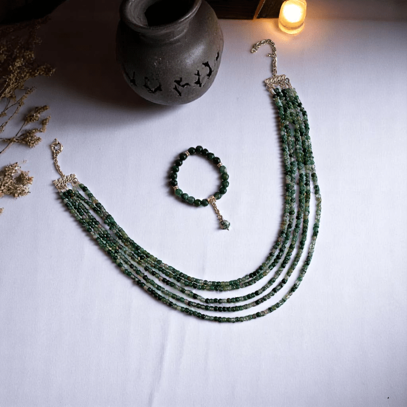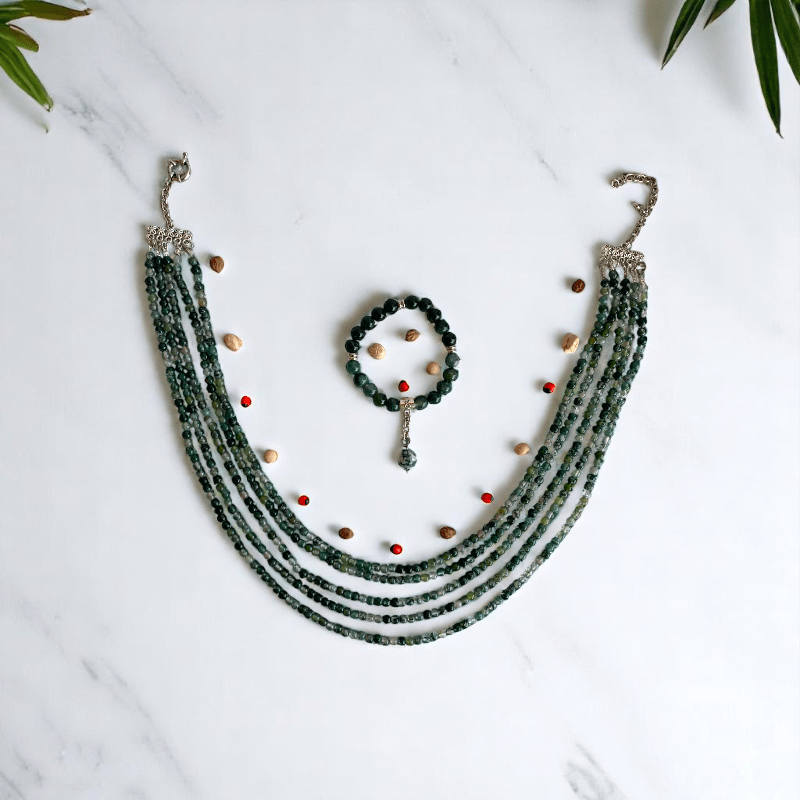 - Embrace the beauty of nature with the Green Moss Agate 5-Layered Necklace & Bracelet Set, a breathtaking fashion statement designed for women who love unique and earthy elegance.