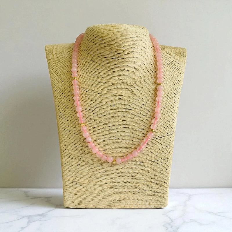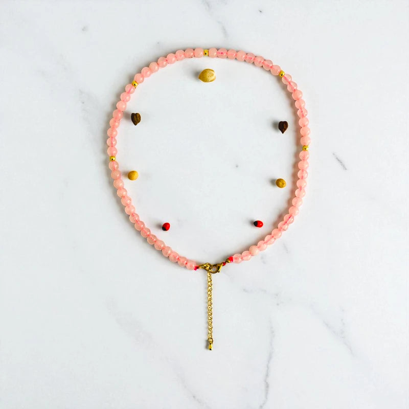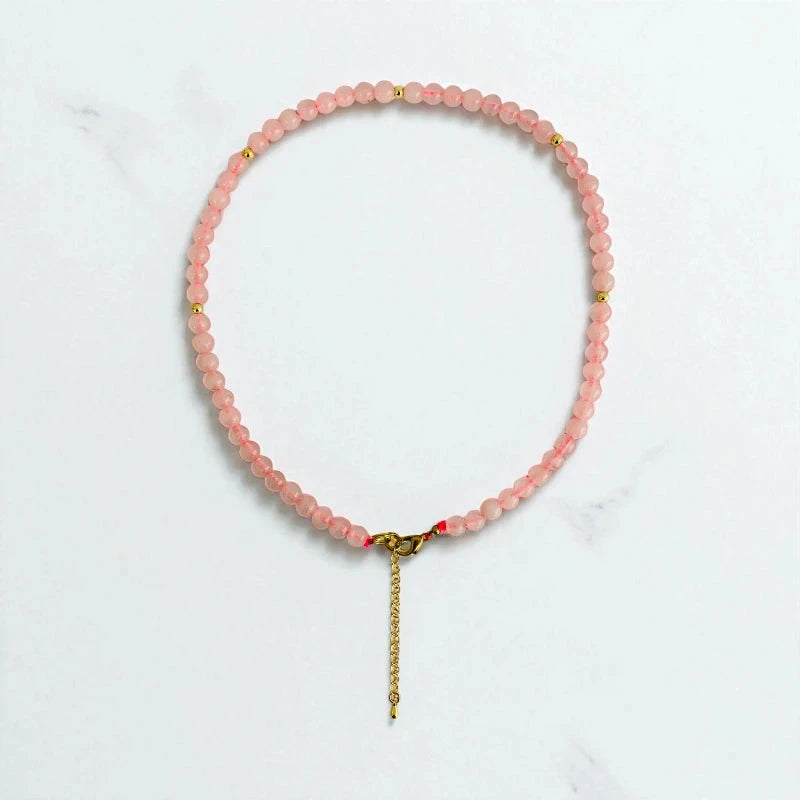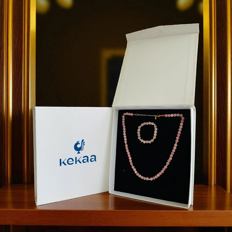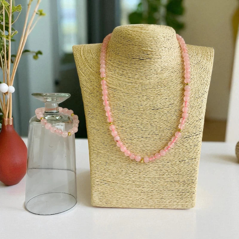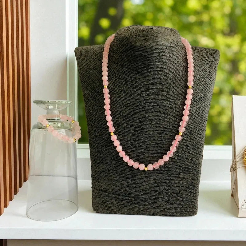 - 💗 Rose Quartz Necklace & Bracelet Set – A charming jewelry duo designed for young girls 🌸 Natural Rose Quartz Stones – Soft pink stones known for their gentle, soothing, and healing properties ✨ Hypoallergenic Spacer Beads – Made from Zinc Alloy, safe and comfortable for sensitive skin 👗 Elegant & Comfortable – Perfectly sized for kids, ideal for everyday wear or special occasions 🎁 Perfect Gift – A thoughtful and meaningful accessory that adds charm and elegance.