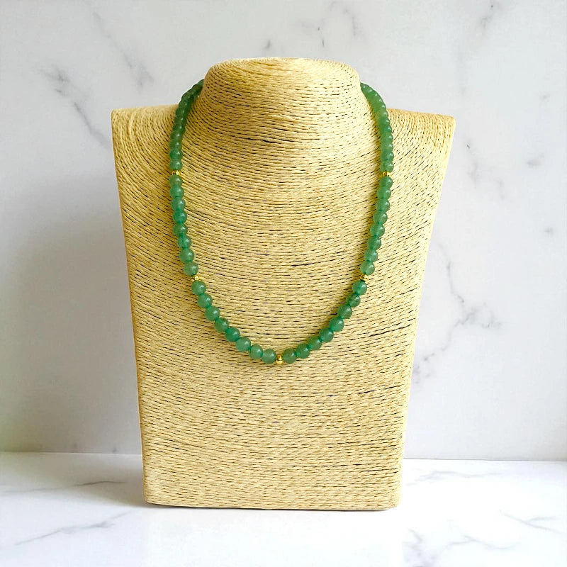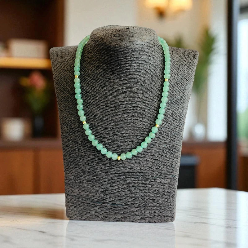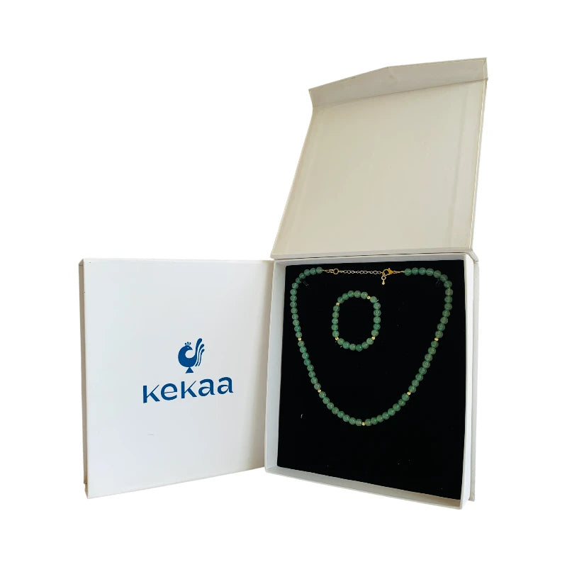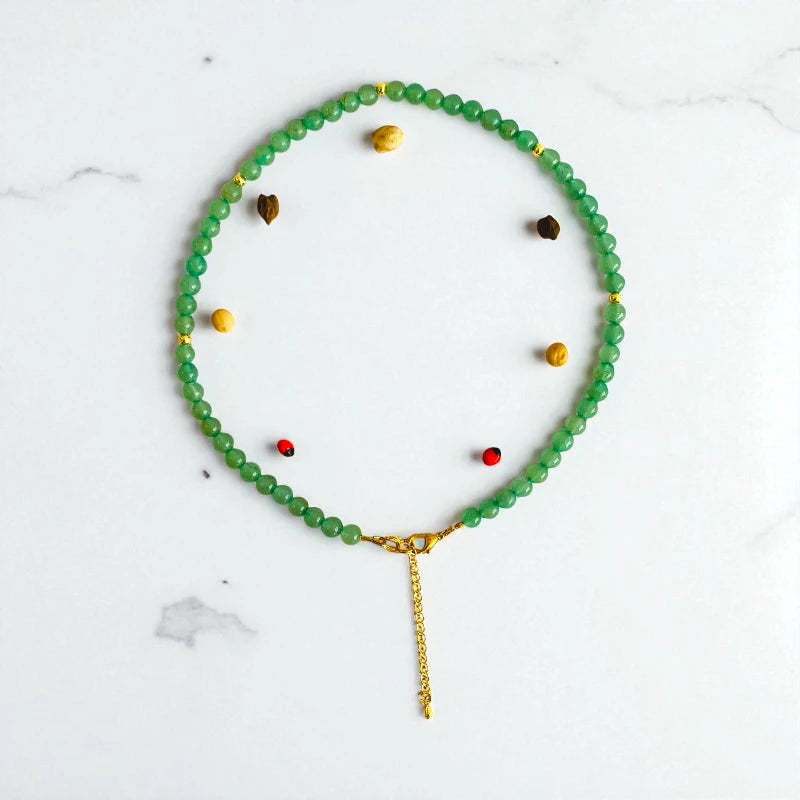 - 🌿 Green Aventurine Necklace & Bracelet Set – A charming jewelry duo thoughtfully designed for young girls 💚 Natural Green Aventurine Stones – Celebrated for their soothing, healing energy and gentle green beauty ✨ Golden Spacer Beads – Crafted from Hypoallergenic Zinc Alloy, safe and comfortable for sensitive skin 👗 Perfect Fit for Kids – Lightweight, elegant, and sized just right for everyday wear or special occasions 🎁 Meaningful Gift Choice – A lovely way to share calmness, positivity, and natural beauty with your little one.