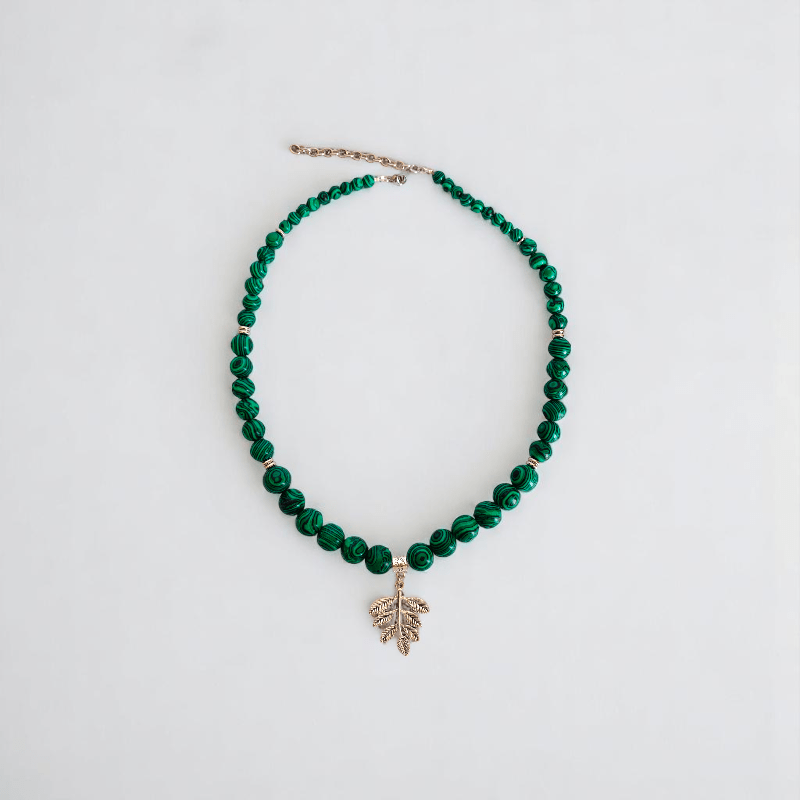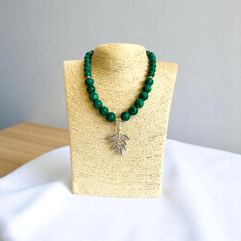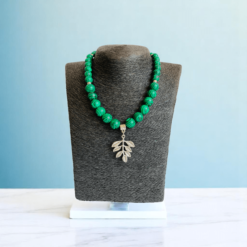 - Includes a striking necklace with a pendant made from green Malachite stone.