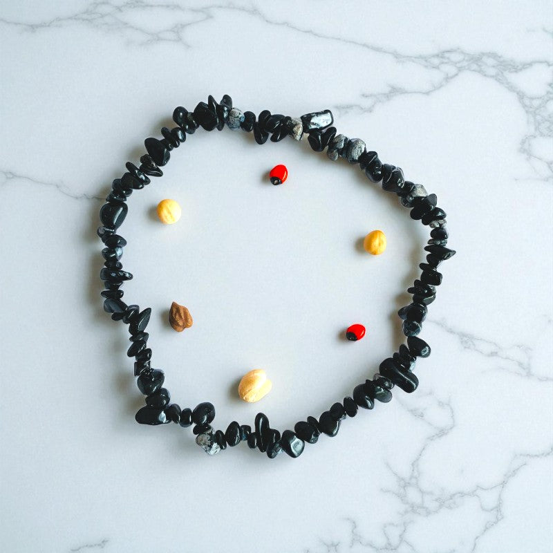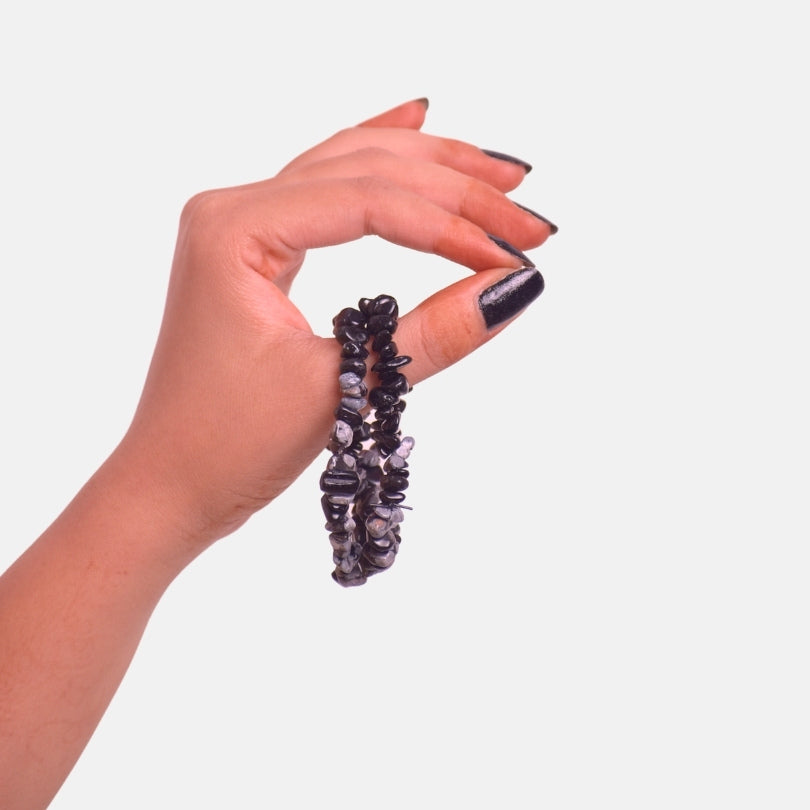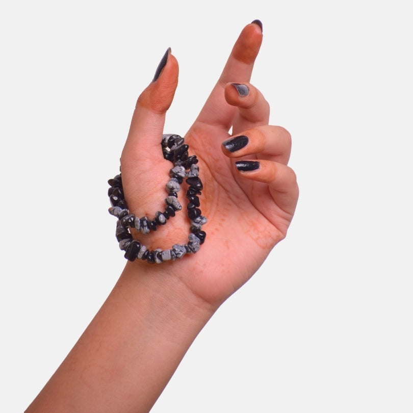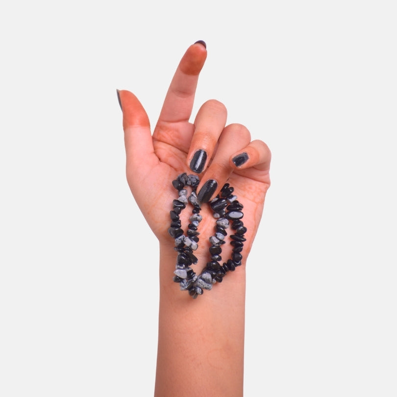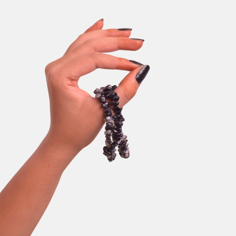 - ❄️ Snowflake Obsidian Stone Chips Bracelet – Features natural snowflake obsidian chips with striking black and gray-white patterns that mimic delicate snowflakes.
