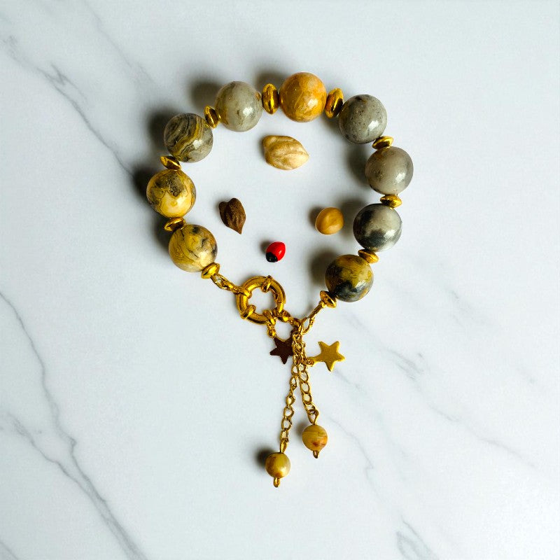 - π Striking Bumblebee Jasper Bracelet β Features the bold and vibrant patterns of genuine Bumblebee Jasper, known for its energetic charm and unique marbling.