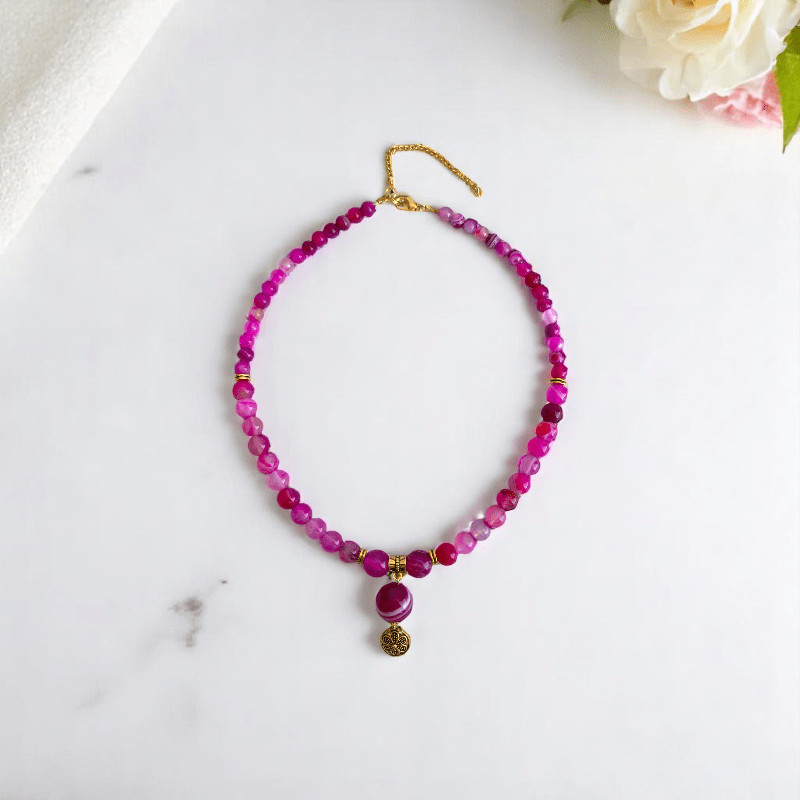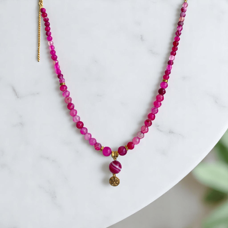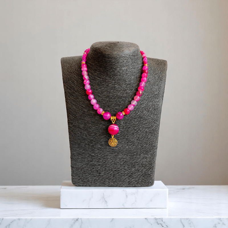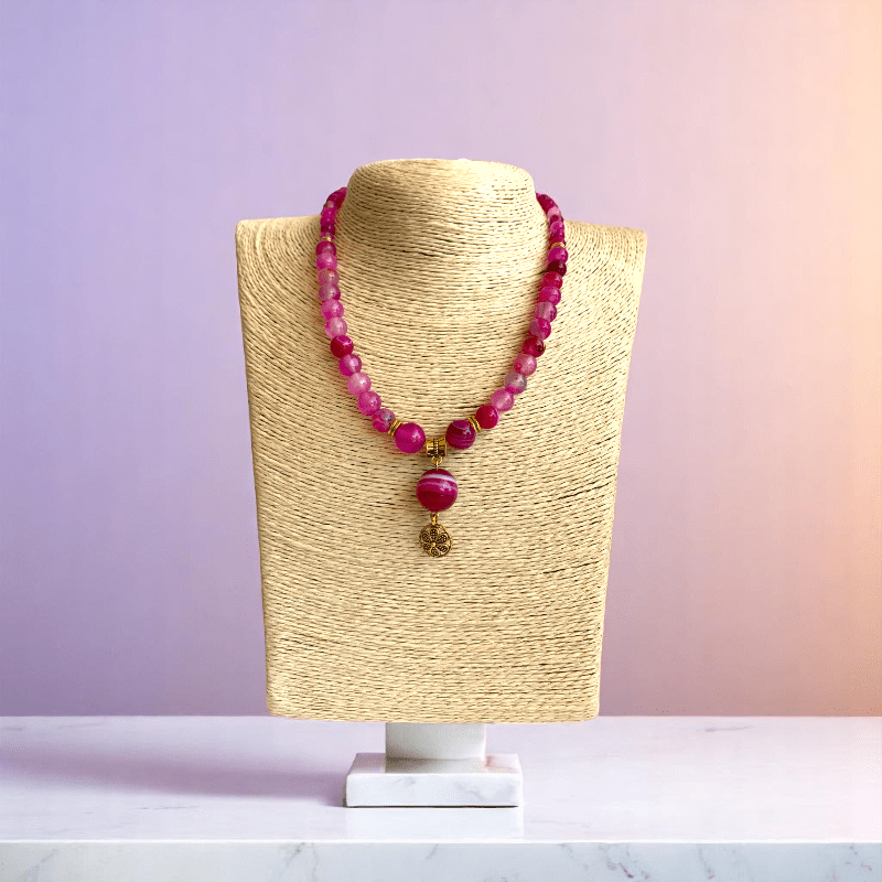 - Add a touch of feminine charm and sophistication to your style with the Pink Banded Agate Necklace & Bracelet Set.