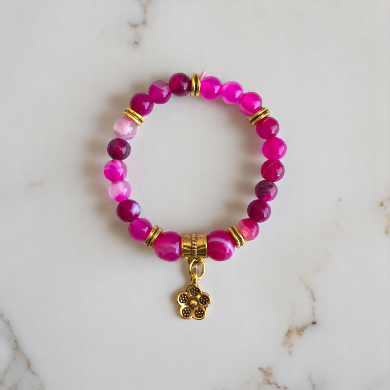 - Designed for women who love graceful yet bold accessories, this stunning set features the delicate beauty of Pink Banded Agate stones, accentuated by golden-colored hypoallergenic Zinc Alloy spacer beads for a luxurious finish.