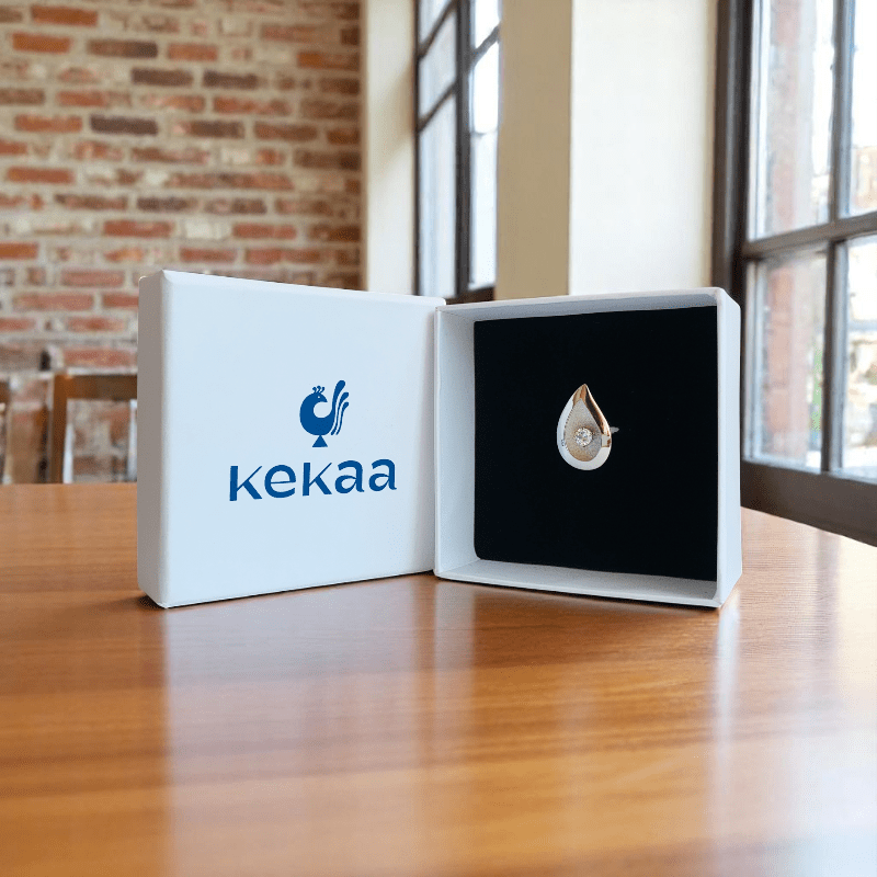- The design features a Rain Drop-shaped top that frames a zirconia stone at its centre — a symbol of natural beauty and timeless style.
