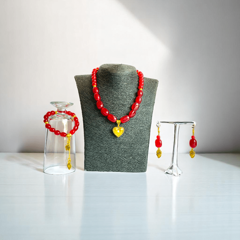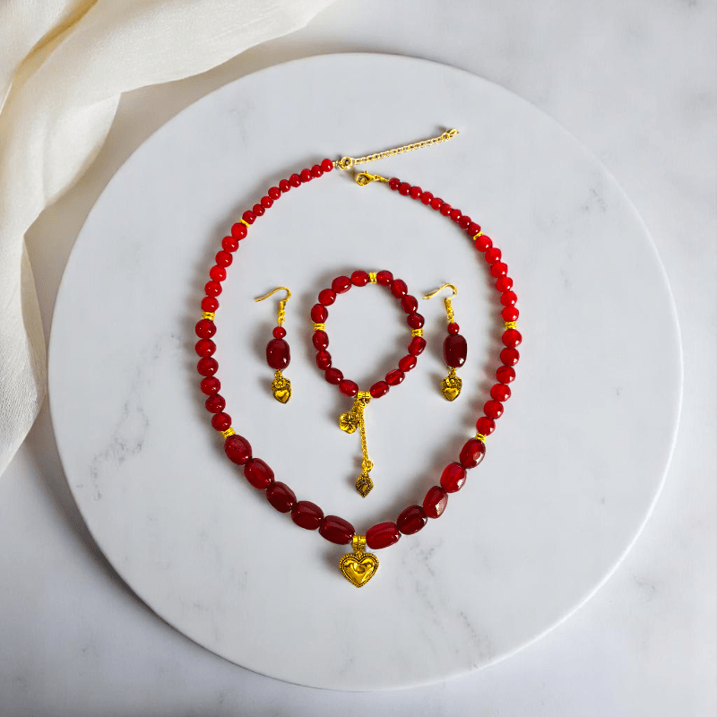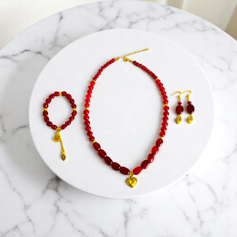 Golden Heart Set | Red Onyx Stone - For Women | Includes: Necklace, Bracelet, Earring