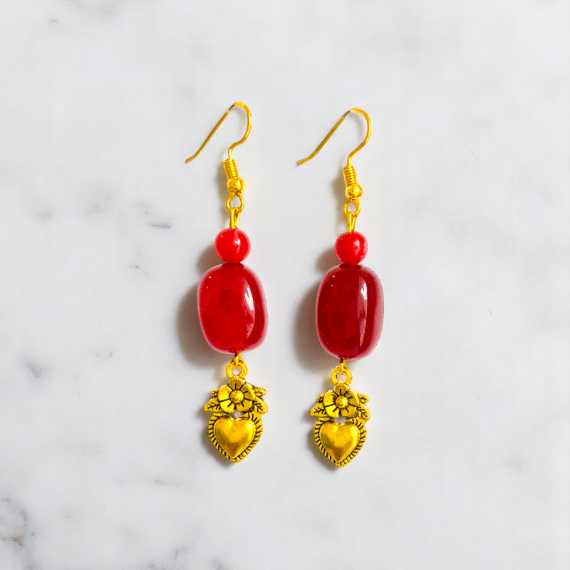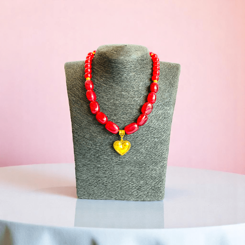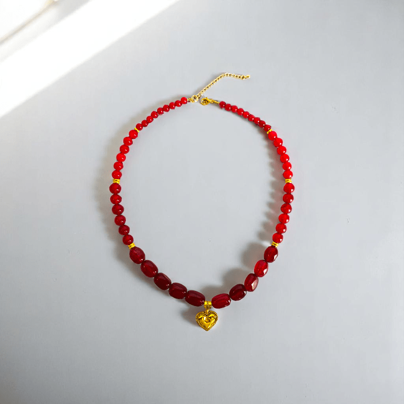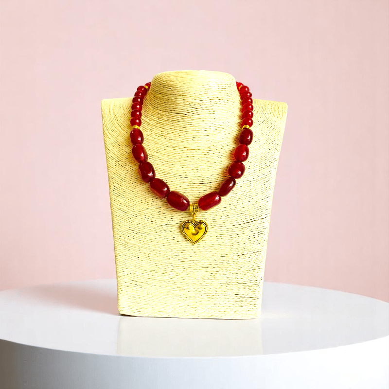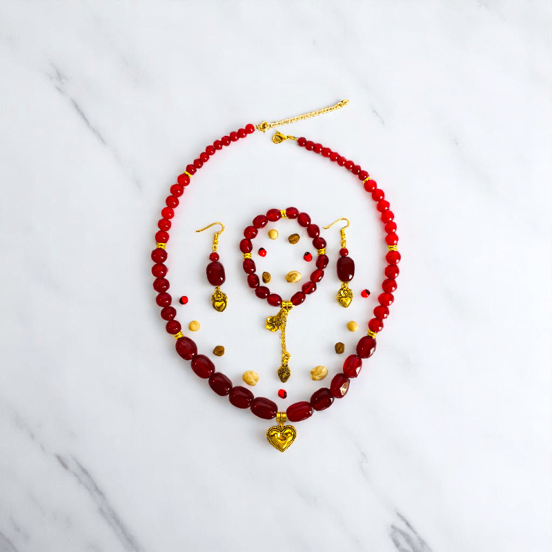 - This set features a stunning necklace with a beautiful golden-colored heart-shaped pendant, showcasing the rich, deep red hues of the Red Onyx stone.