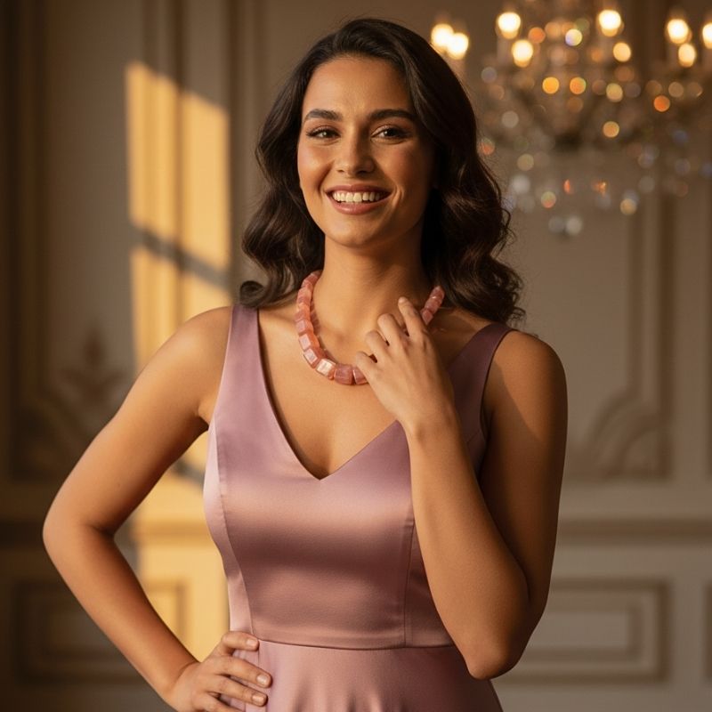 - Featuring the soft yet striking hues of rosy pink and deep red, this necklace is a symbol of love, joy, and confidence.