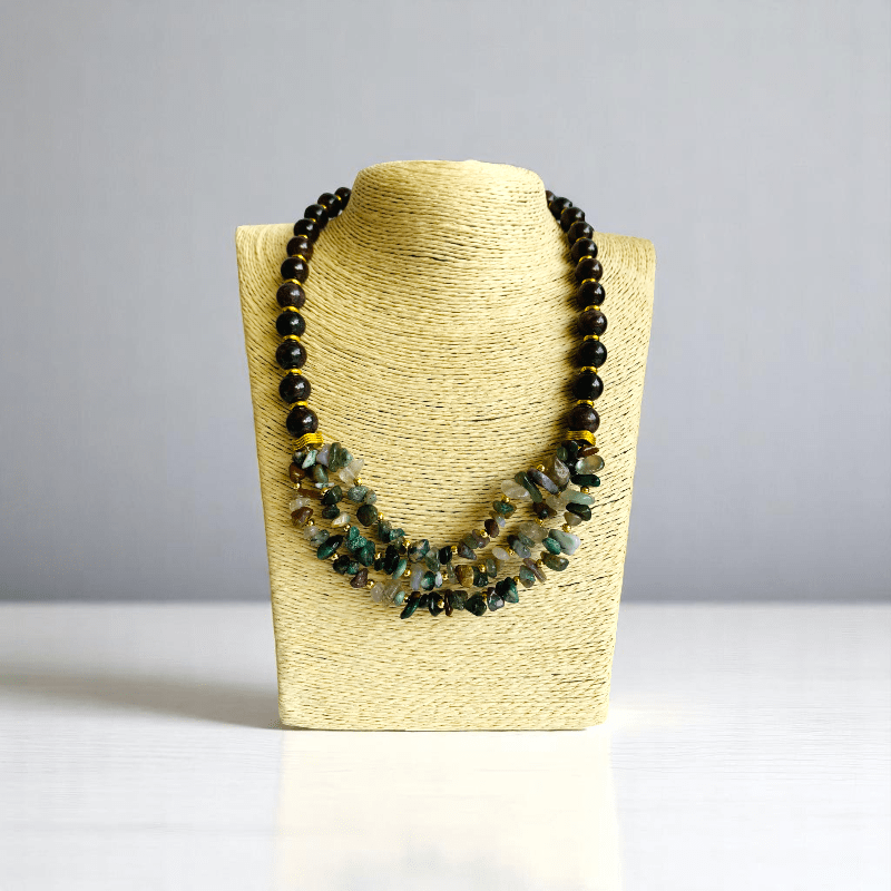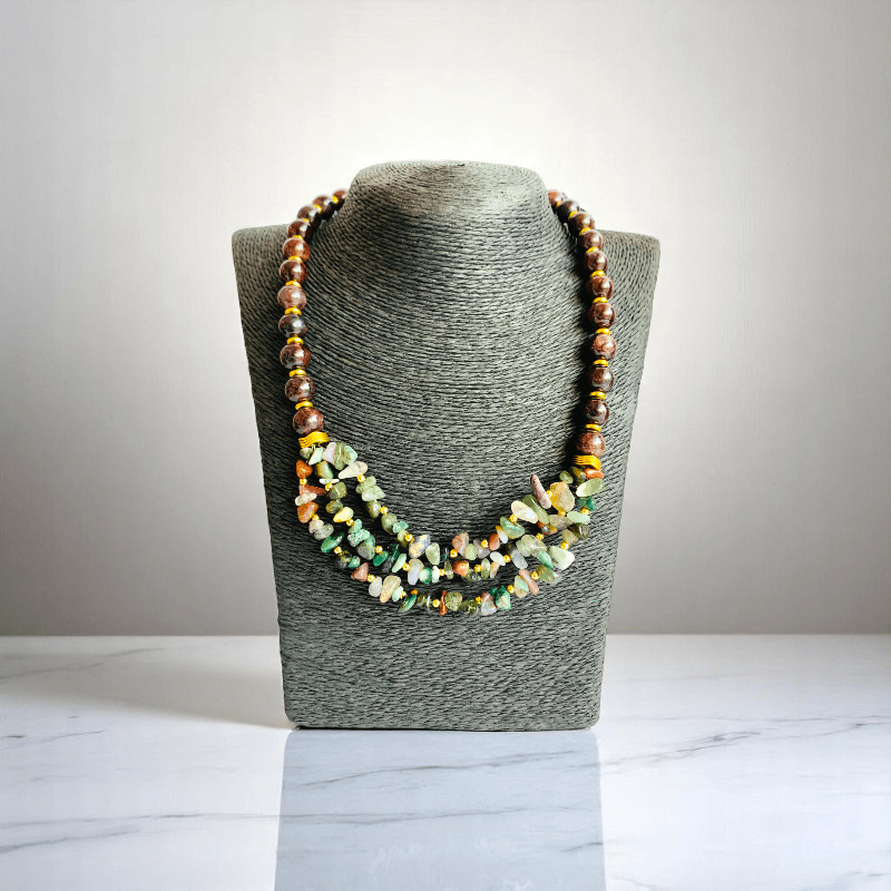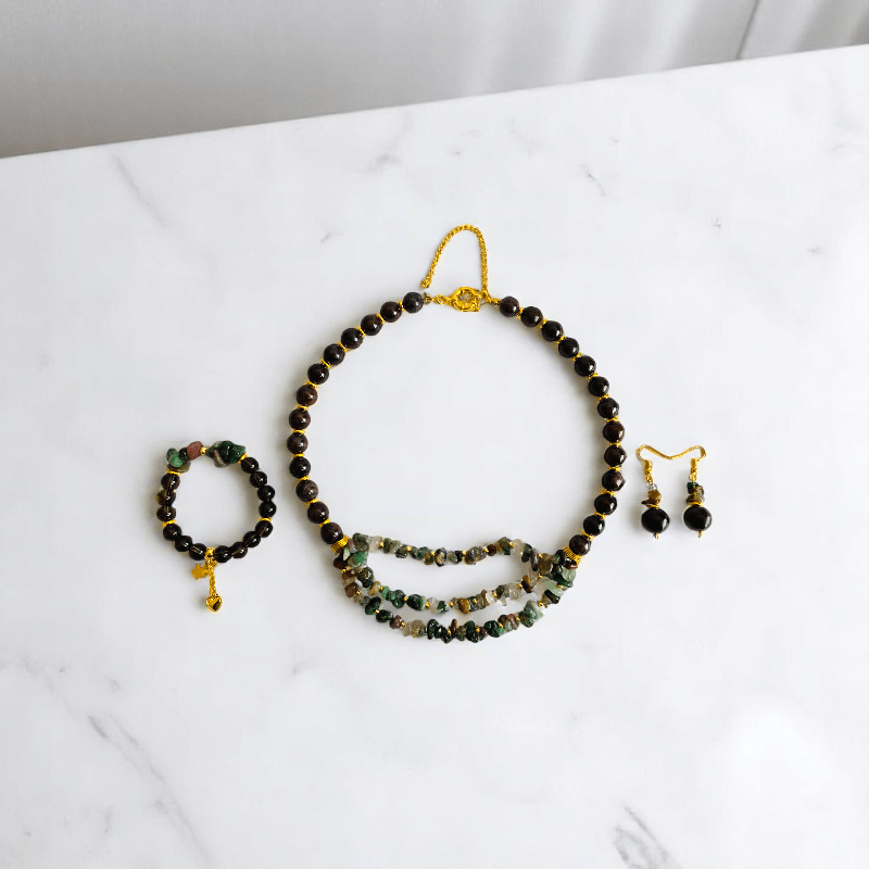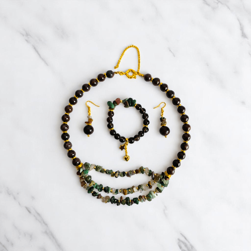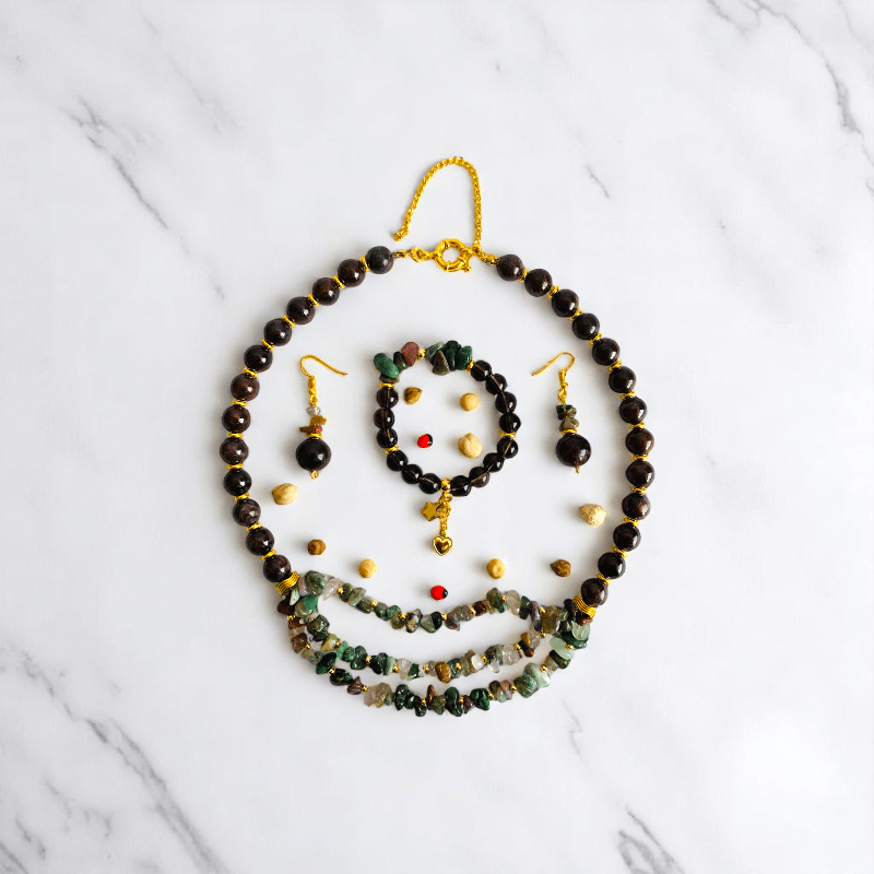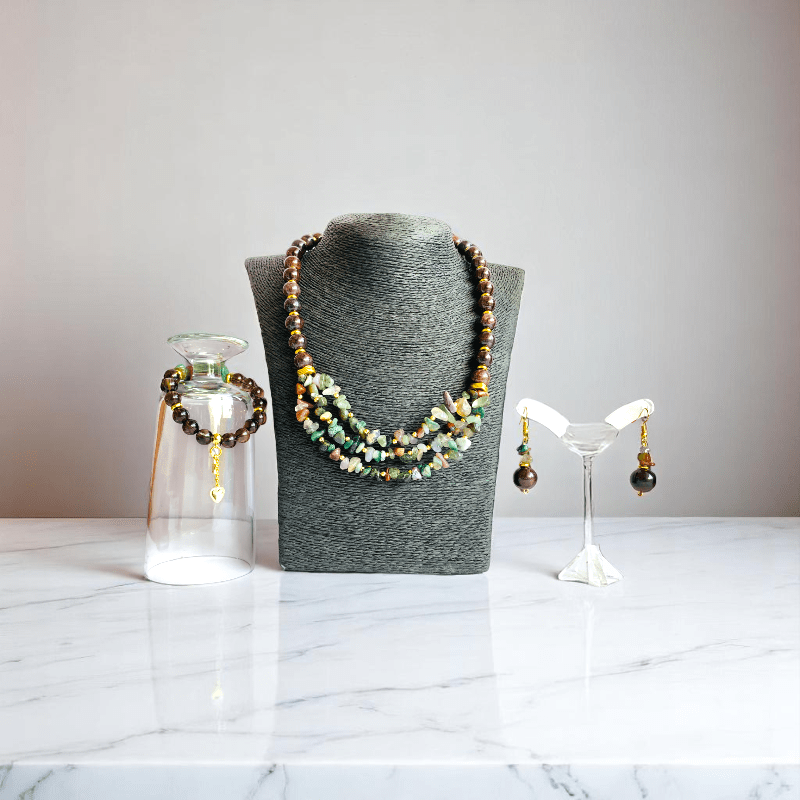 - Add a touch of elegance and earthy charm to your jewellery collection with this beautifully crafted Indian Agate & Red Tiger Eye Jewellery Set.