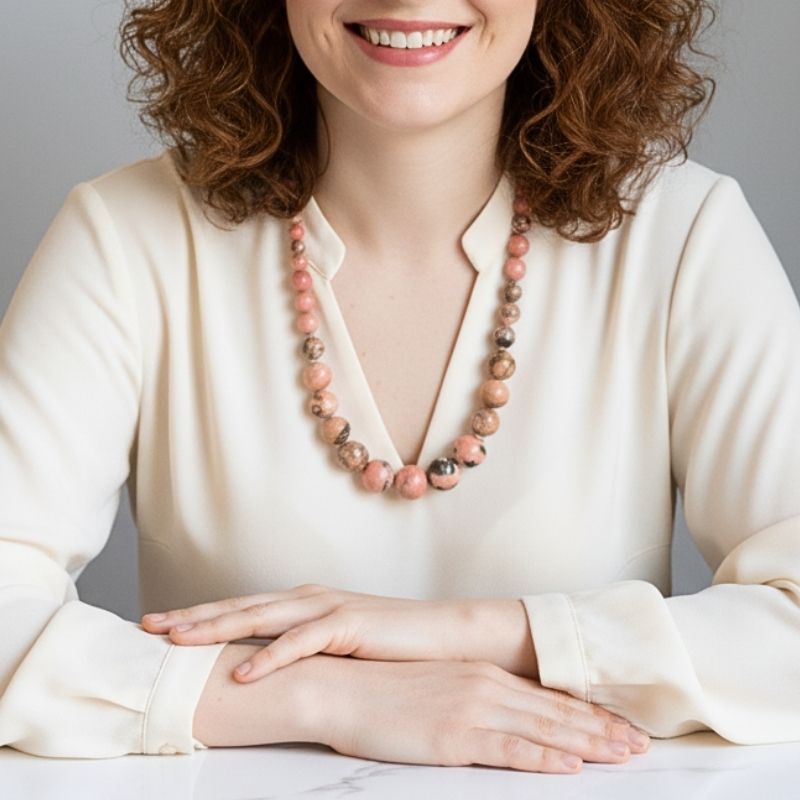 - Featuring the soft pink hues and striking black veins of natural Rhodonite, this necklace is perfect for those who love jewelry that symbolizes love, inner strength, and balance.