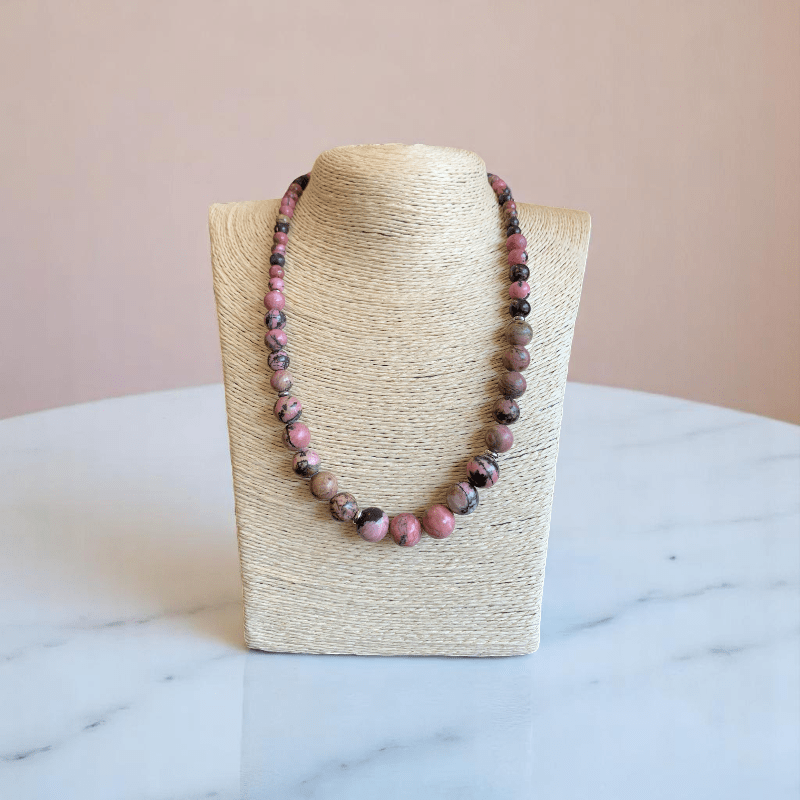 - The necklace features smooth, polished Rhodonite stones that create a striking visual contrast, while the matching bracelet offers a coordinated, sophisticated look.