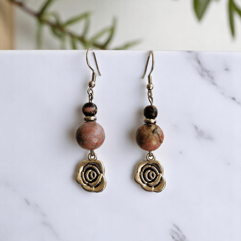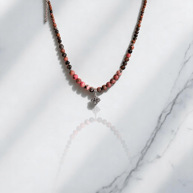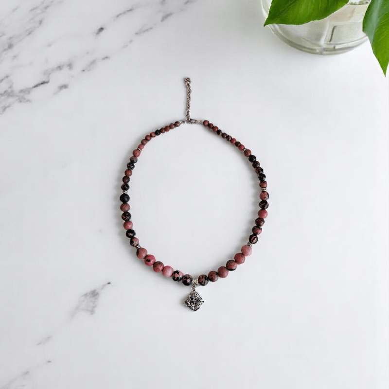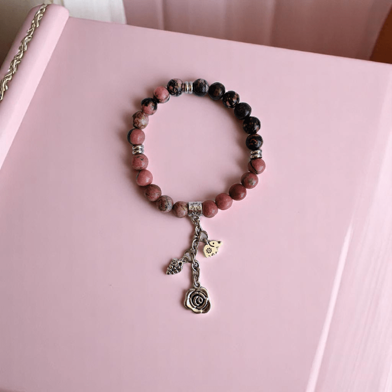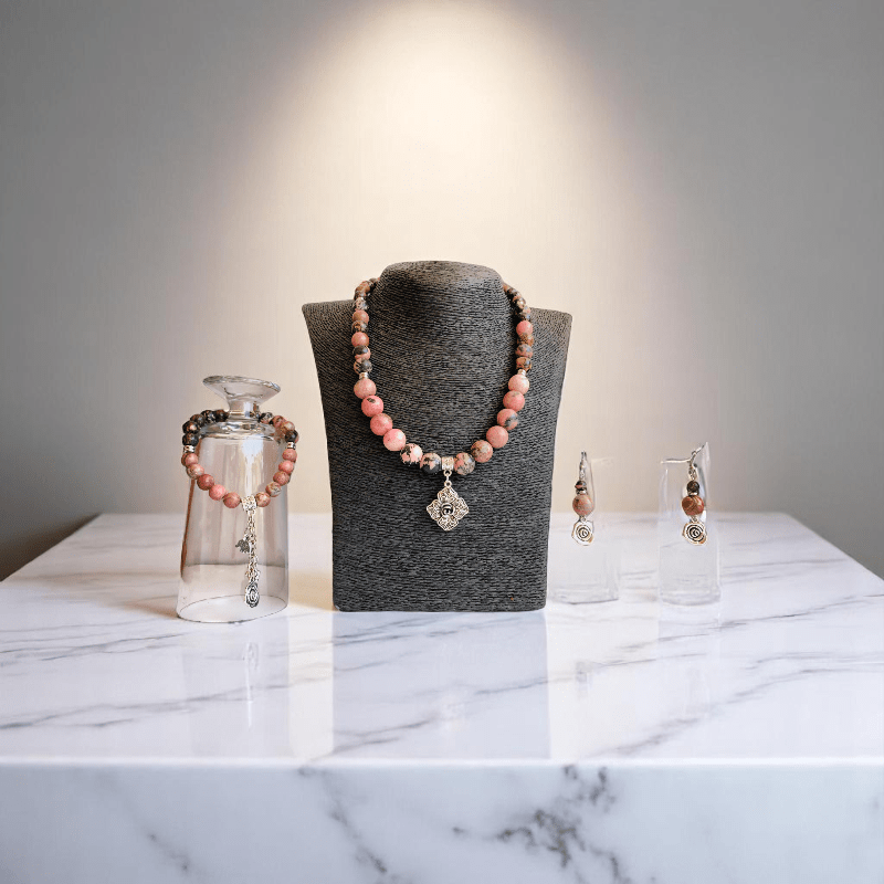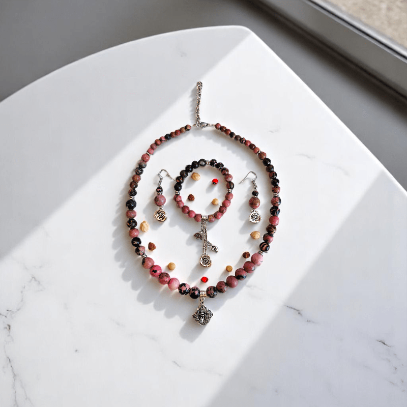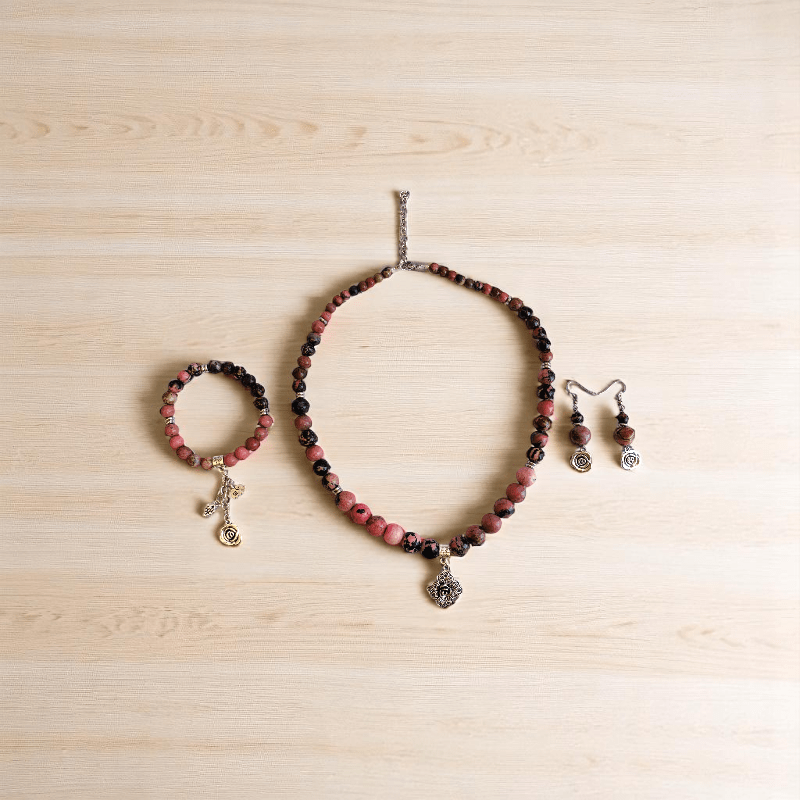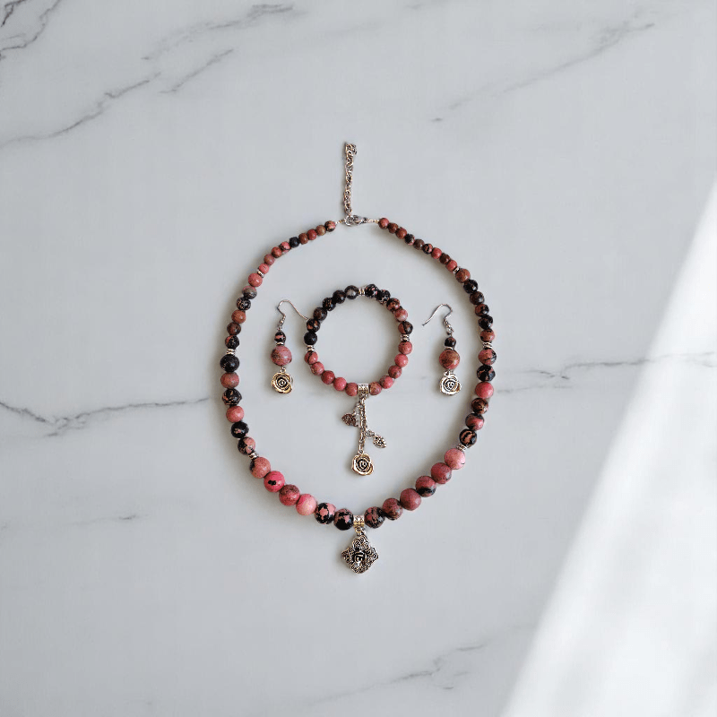 - A matching bracelet, and a pair of earrings. Each piece is thoughtfully designed to combine beauty with the nurturing properties of Rhodonite.