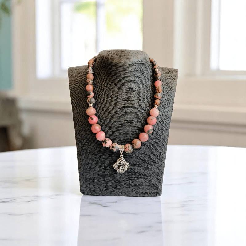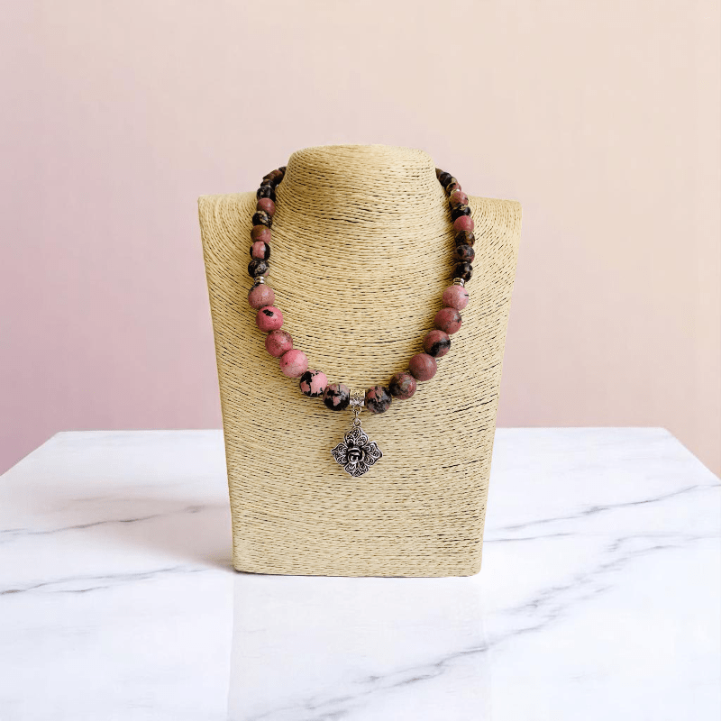 - Add a touch of elegance and healing energy to your collection with the Rhodonite Stone Jewellery Set, featuring a necklace with a stunning rose-shaped pendant.
