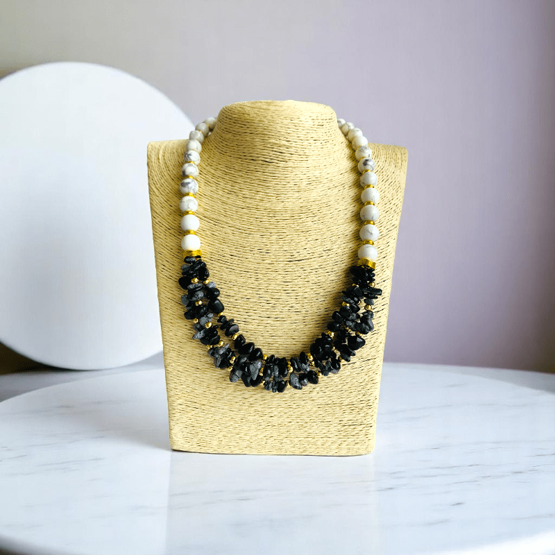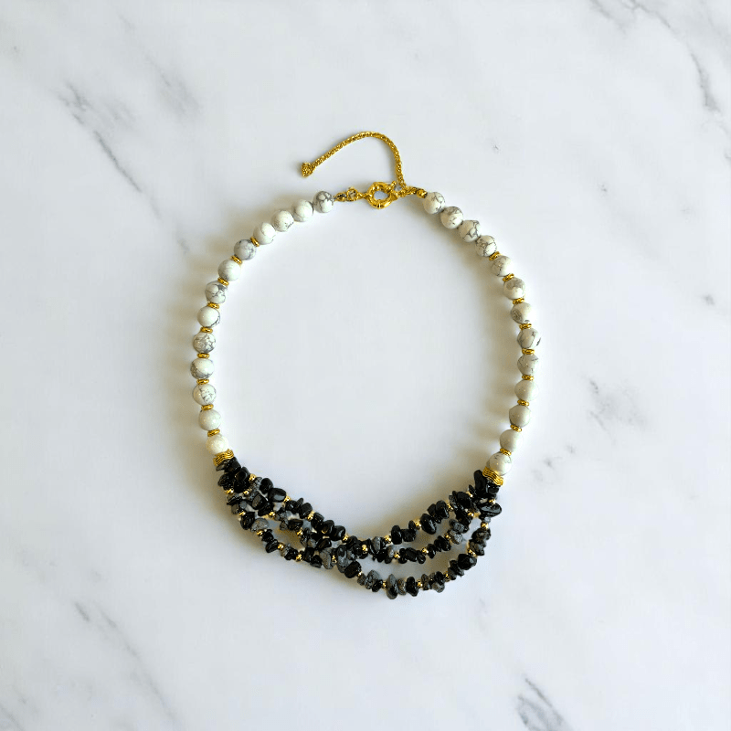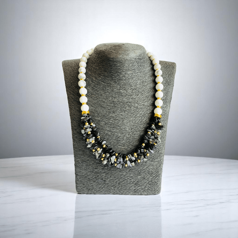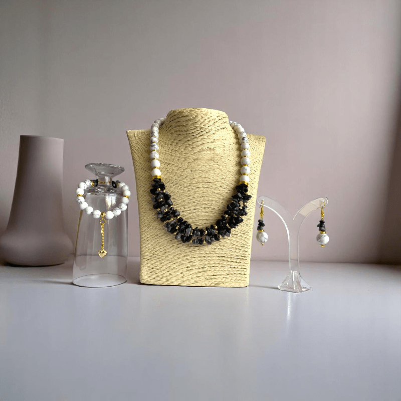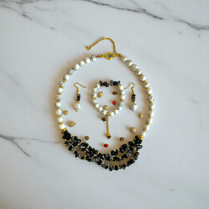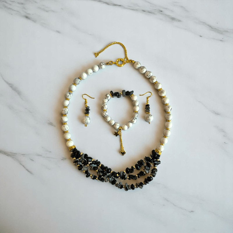 - Elevate your accessory game with this stunning Snowflake Chip Stone and White Howlite Bead Necklace Set, complete with a matching bracelet and earrings.
