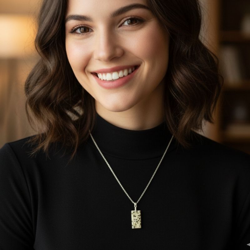 - Authentic Dalmatian Jasper Pendant – features a genuine, natural stone known for its playful black-and-cream spotted pattern.