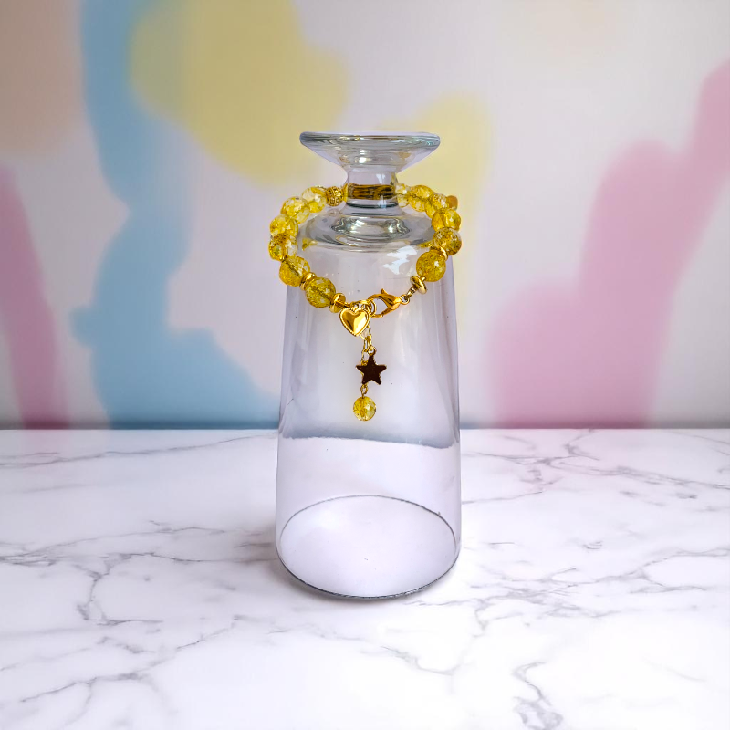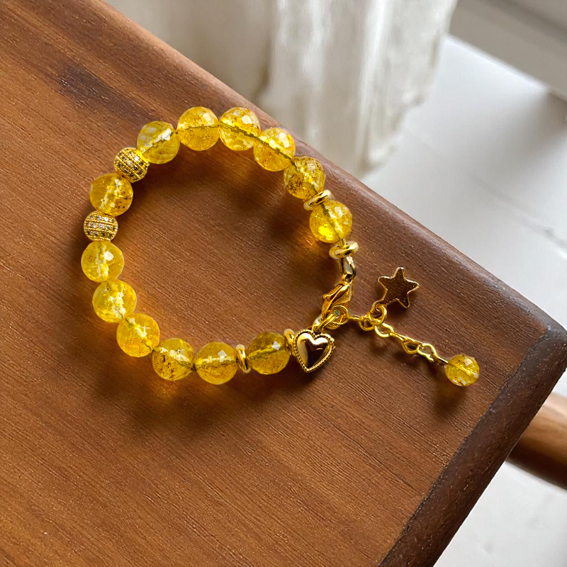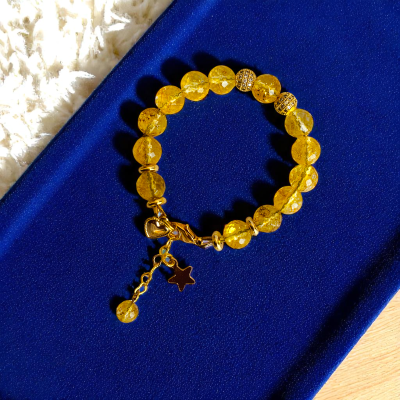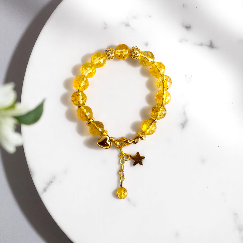 - 🌞 Citrine Stone Bracelet – A charming bracelet designed with natural citrine stones that shine with warm, sunny energy ✨ Positive & Uplifting – Known to inspire confidence, joy, and creativity, making it a cheerful accessory for kids 🌟 Durable Spacer Beads – Hypoallergenic zinc alloy beads add style, strength, and comfort for sensitive skin 💖 Heart & Star Charms – The heart symbolizes love, while the star represents hope and dreams, adding a magical touch 👗 Stylish & Meaningful – A bracelet that blends sparkle with symbolism for everyday wear or special occasions 🎁 Perfect Gift for Kids – A delightful and thoughtful accessory that children will treasure.