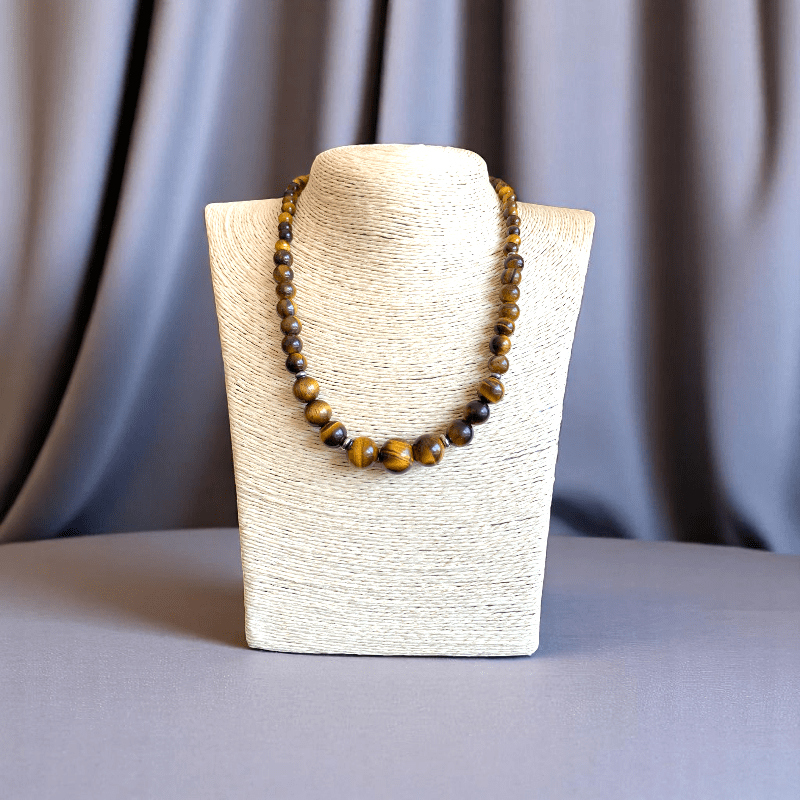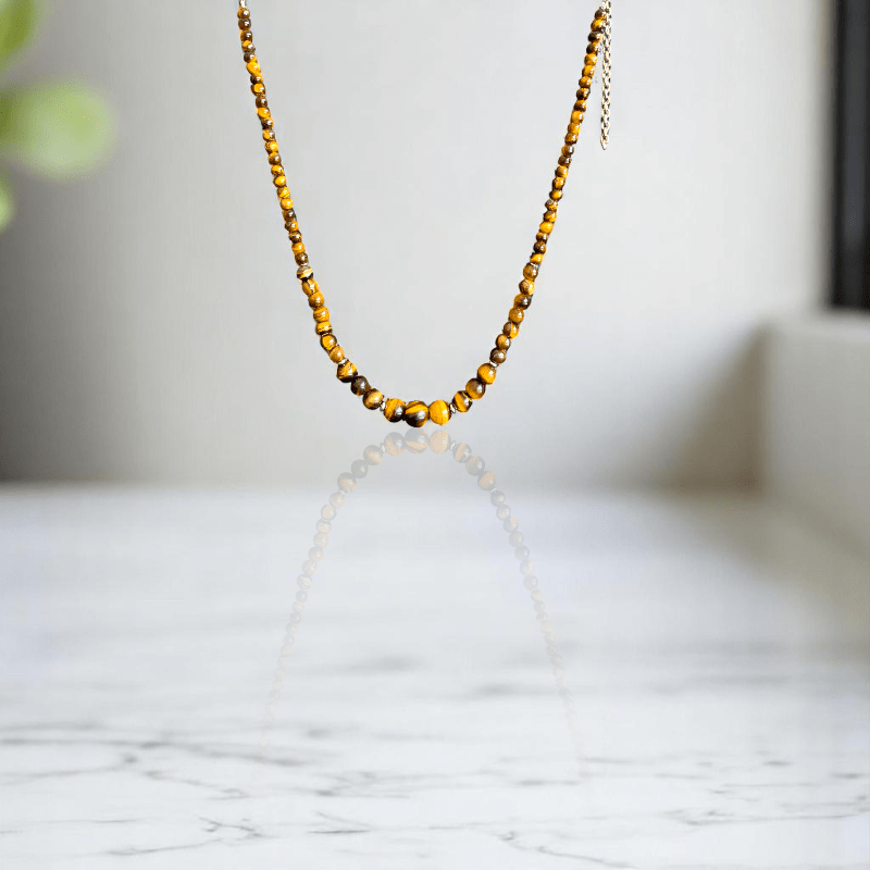 - The necklace features stunning Tiger Eye stones, known for their golden-brown hues and striking chatoyancy (the unique reflective quality), making it a standout piece in any jewellery collection.
