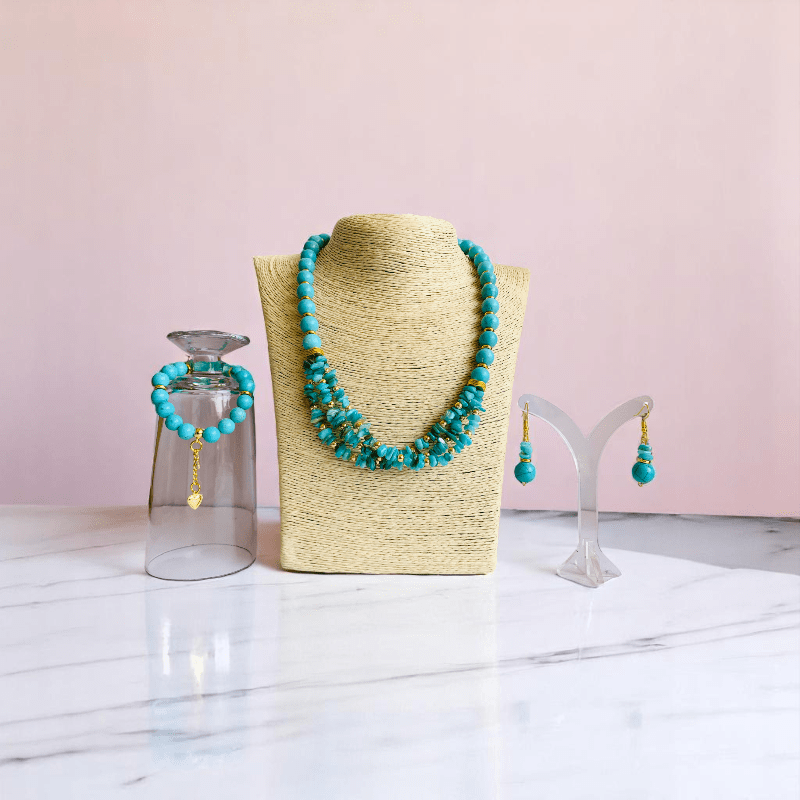 - Add a pop of vibrant color and elegance to your jewellery collection with this stunning Turquoise Chip and Bead Necklace Set, complete with a matching bracelet and earrings.