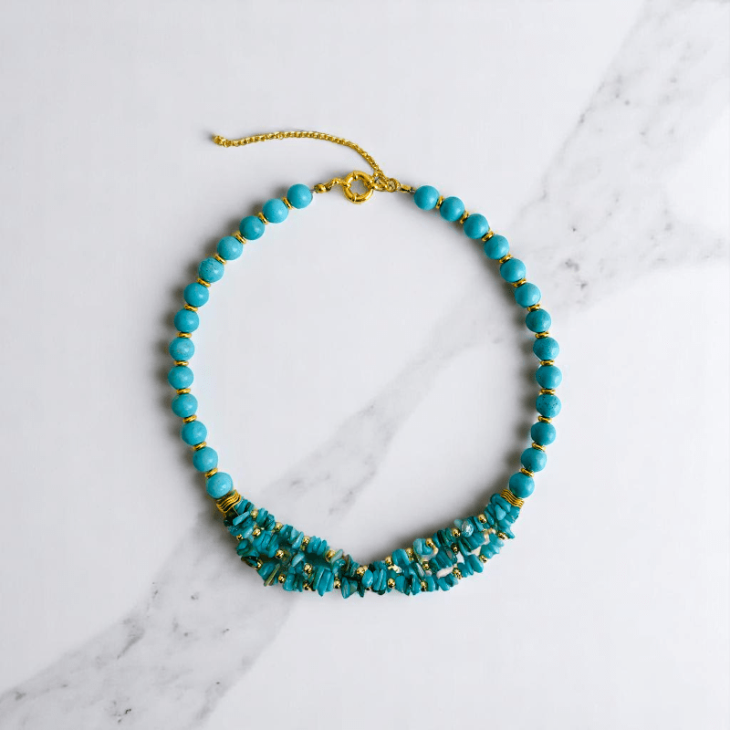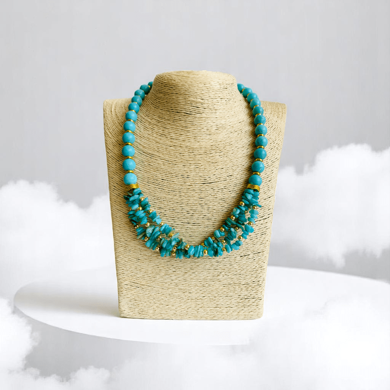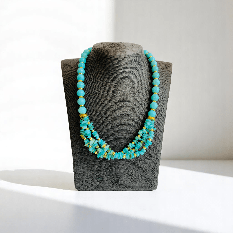 - The necklace features a unique triple-layer design, combining beautifully polished Turquoise chips and beads in varying sizes to create a rich, textured look.