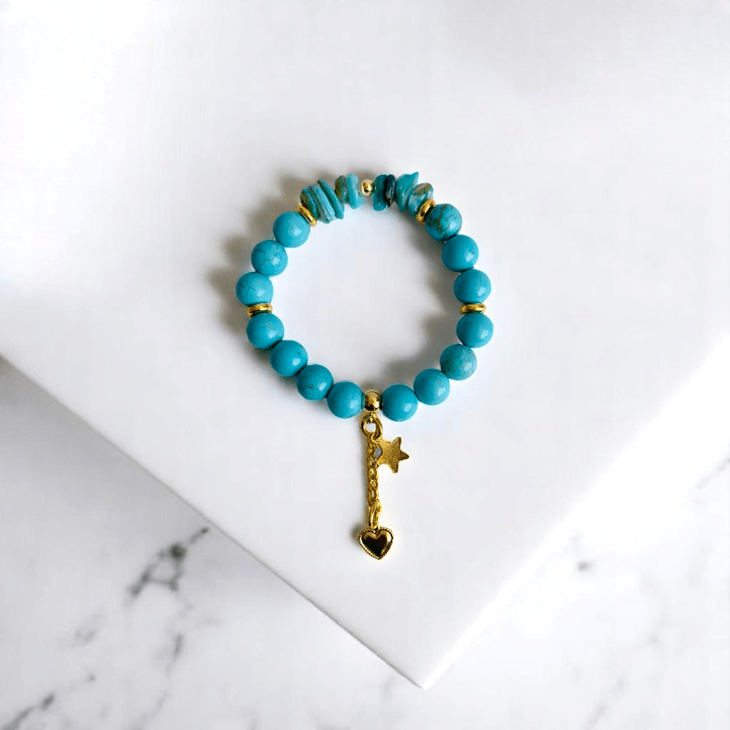 - The design is further enhanced with golden spacer beads made from hypoallergenic zinc alloy, adding a touch of sophistication and shine that perfectly complements the natural beauty of the Turquoise.
