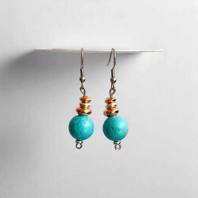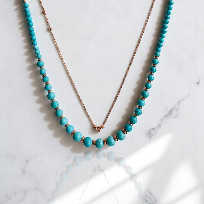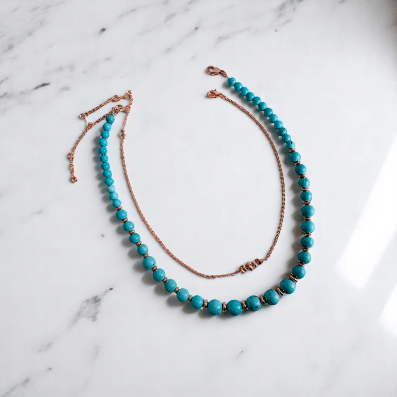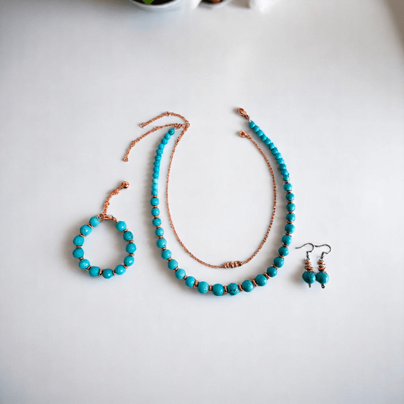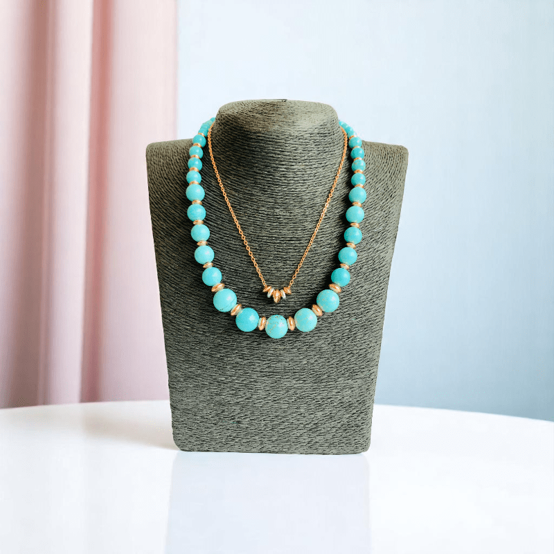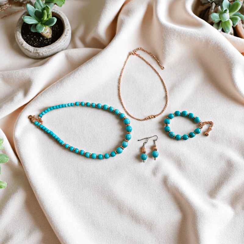 - This set includes a Turquoise stone necklace, a delicate chain, a bracelet, and a matching pair of earrings, all accented with hypoallergenic Zinc Alloy spacer beads and chain for a refined and sophisticated touch.