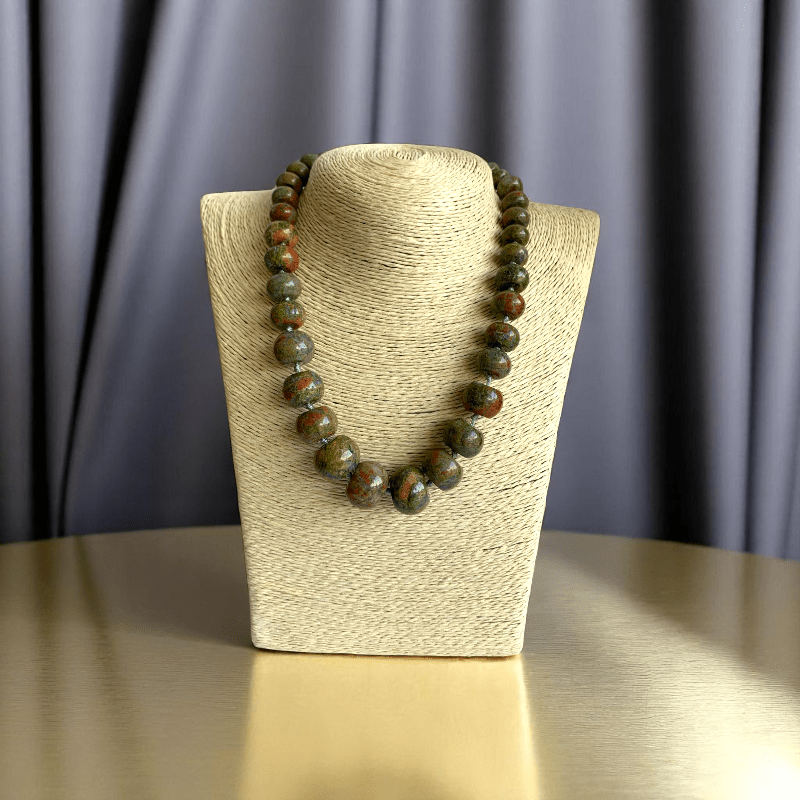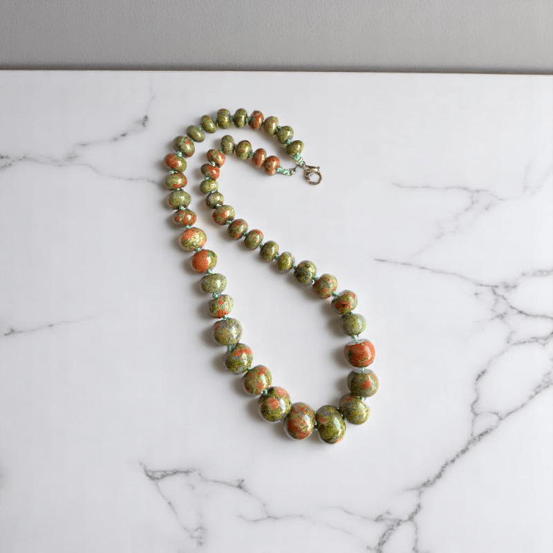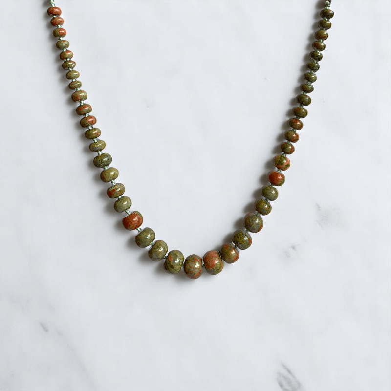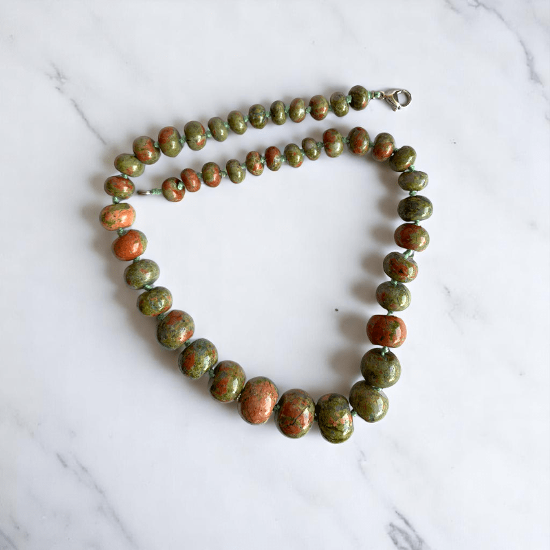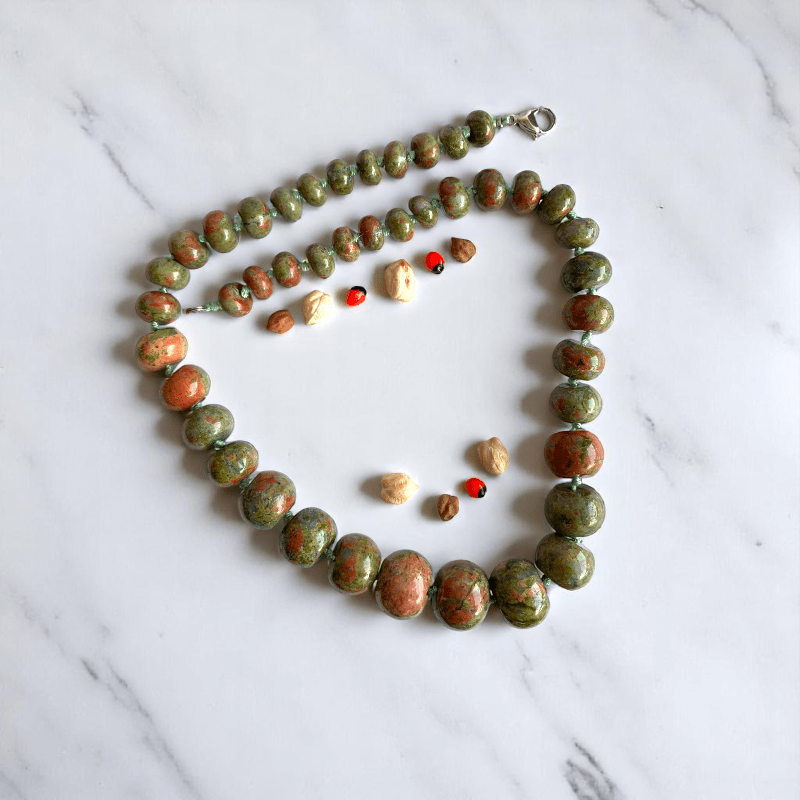 - Featuring Unakite gemstones, this necklace showcases a unique blend of earthy green and soft pink hues, symbolizing harmony, love, and transformation.