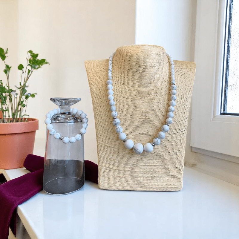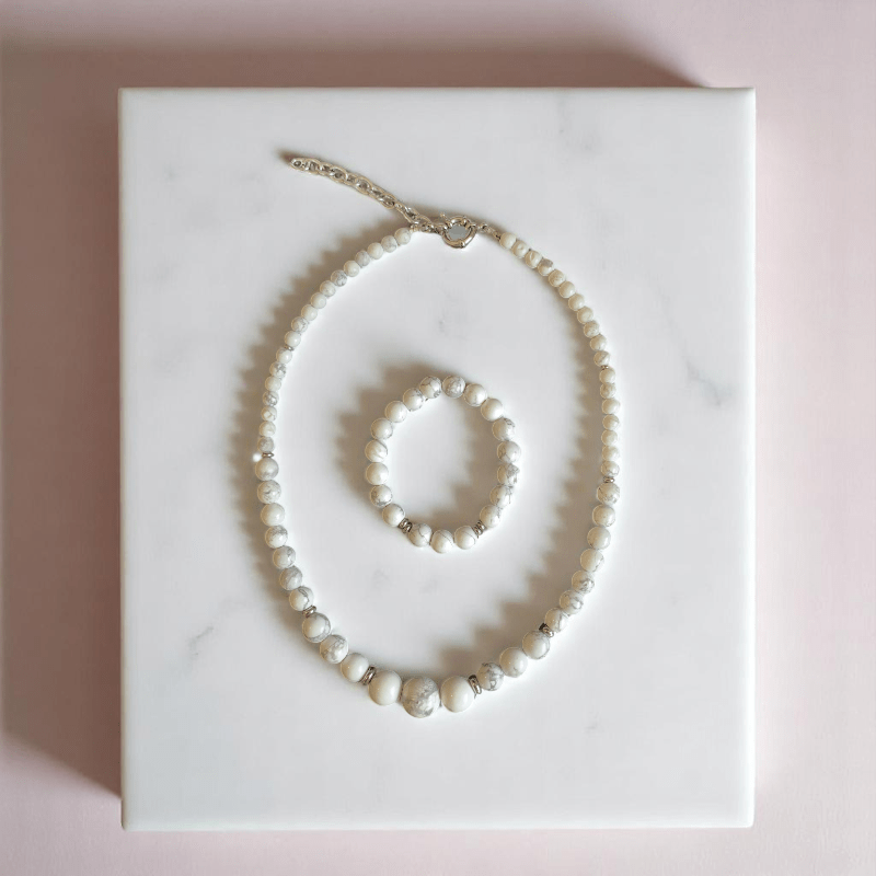 - Elevate your style with the timeless elegance of the White Howlite Stone Necklace and Bracelet Set.
