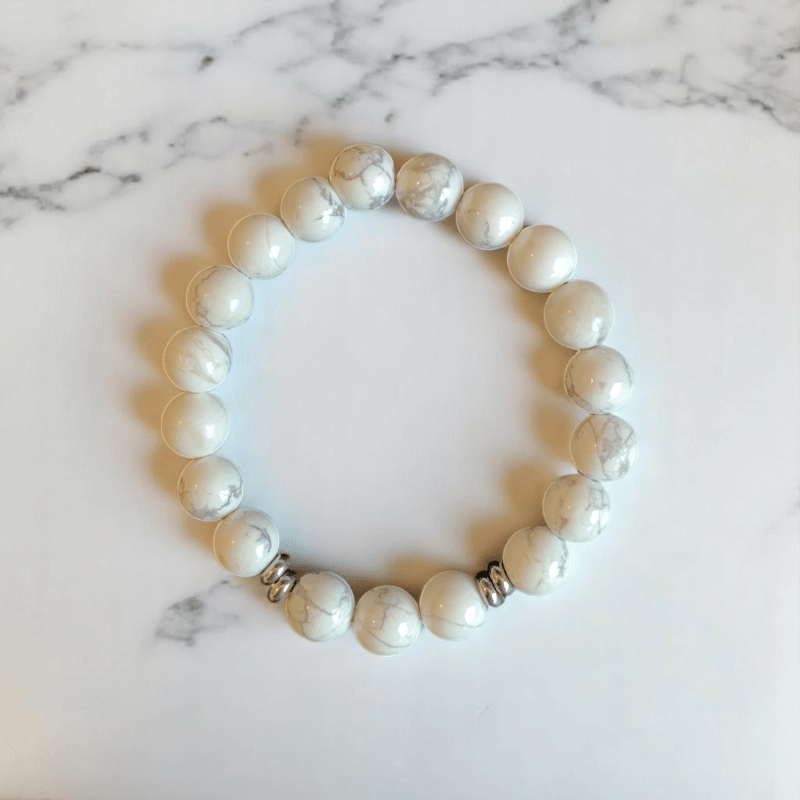 - Featuring smooth, white Howlite stones with their striking grey veining, this set exudes a serene and calming energy, perfect for adding a subtle yet sophisticated touch to any outfit.